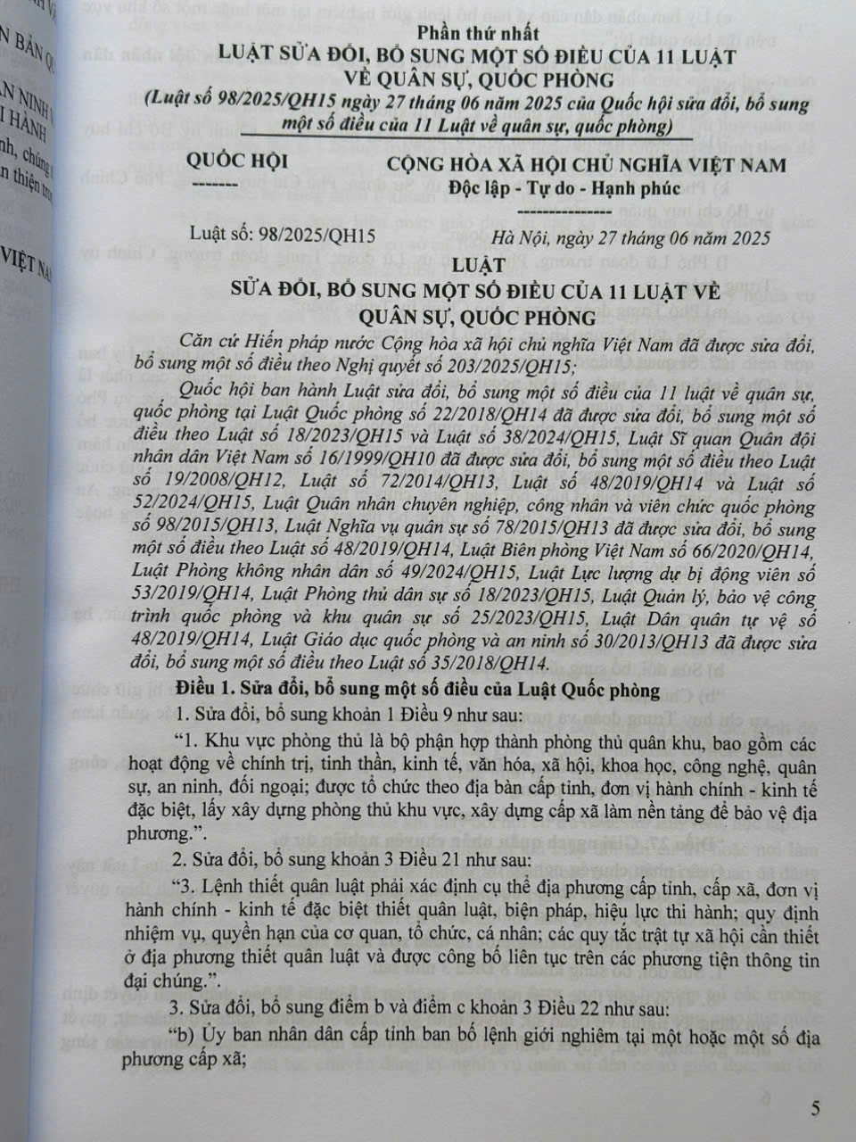 VỀ QUÂN SỰ, QUỐC PHÒNG (Luật số 98/2025/QH15 ngày 27 tháng 06 năm 2025 của Quốc hội sửa đổi, bổ sung một số điều của 11 Luật về quân sự, quốc phòng)