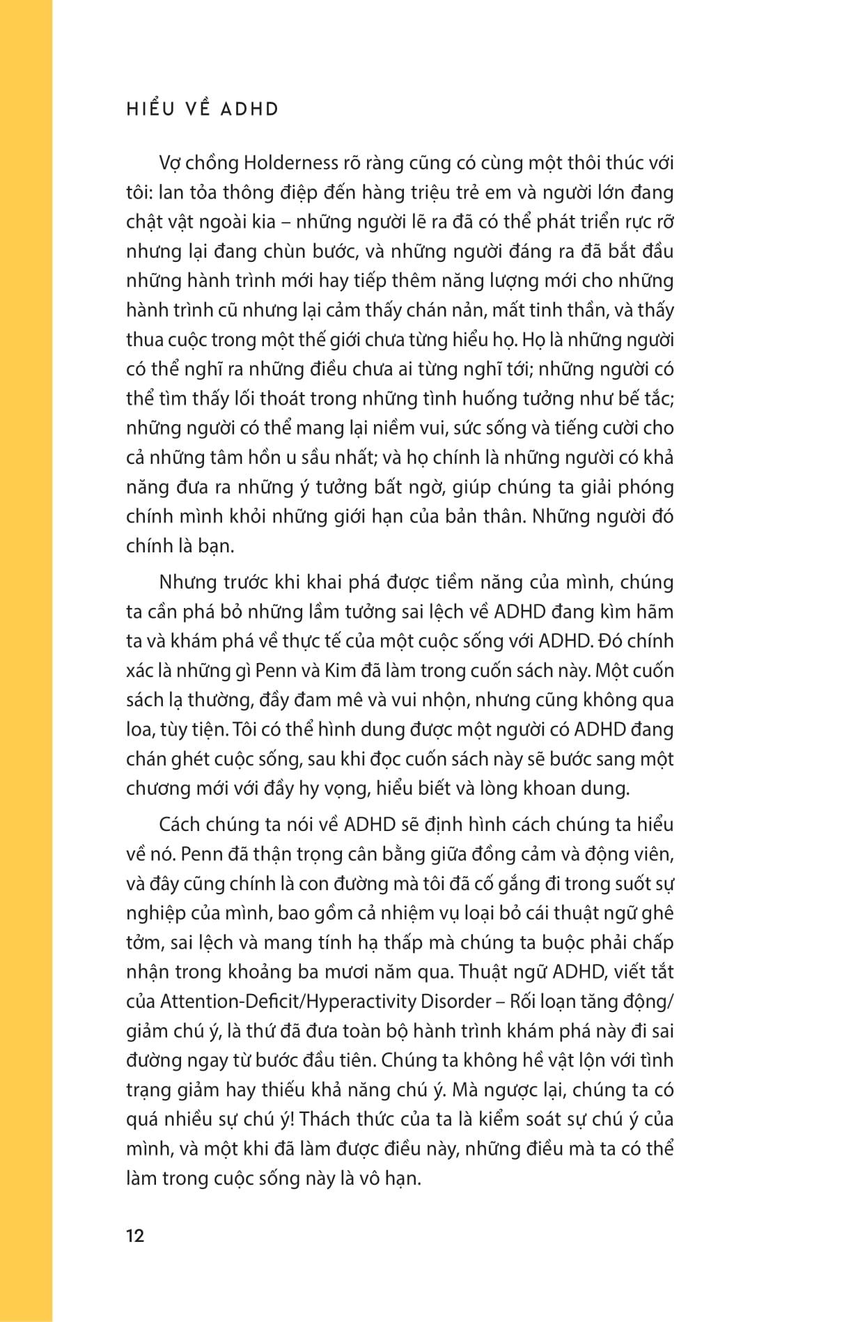 Nội dung sách được chia thành ba phần. Ở phần đầu, Penn và Kim giải thích ADHD là gì, nguyên nhân từ đâu, biểu hiện ra sao ở trẻ em, người lớn, phụ nữ và các nhóm khác nhau. Bạn sẽ nhận ra những hiểu lầm phổ biến – như việc cho rằng ADHD đồng nghĩa với “thiếu tập trung” hay “lười biếng”, thực chất chỉ là kết quả của sự thiếu hiểu biết về cách não bộ ADHD xử lý thông tin. Phần hai tập trung vào việc thay đổi câu chuyện mà chúng ta vẫn thường kể về ADHD. Thay vì chỉ nói về khuyết điểm và hạn chế, tác giả chỉ ra những khía cạnh tích cực, cả trong công việc, sáng tạo, mối quan hệ và cuộc sống. Cuối cùng, phần ba đưa ra những chiến lược thực tiễn: cách quản lý năng lượng, xây dựng thói quen, điều chỉnh môi trường sống, hoàn thành mục tiêu và chăm sóc bản thân.