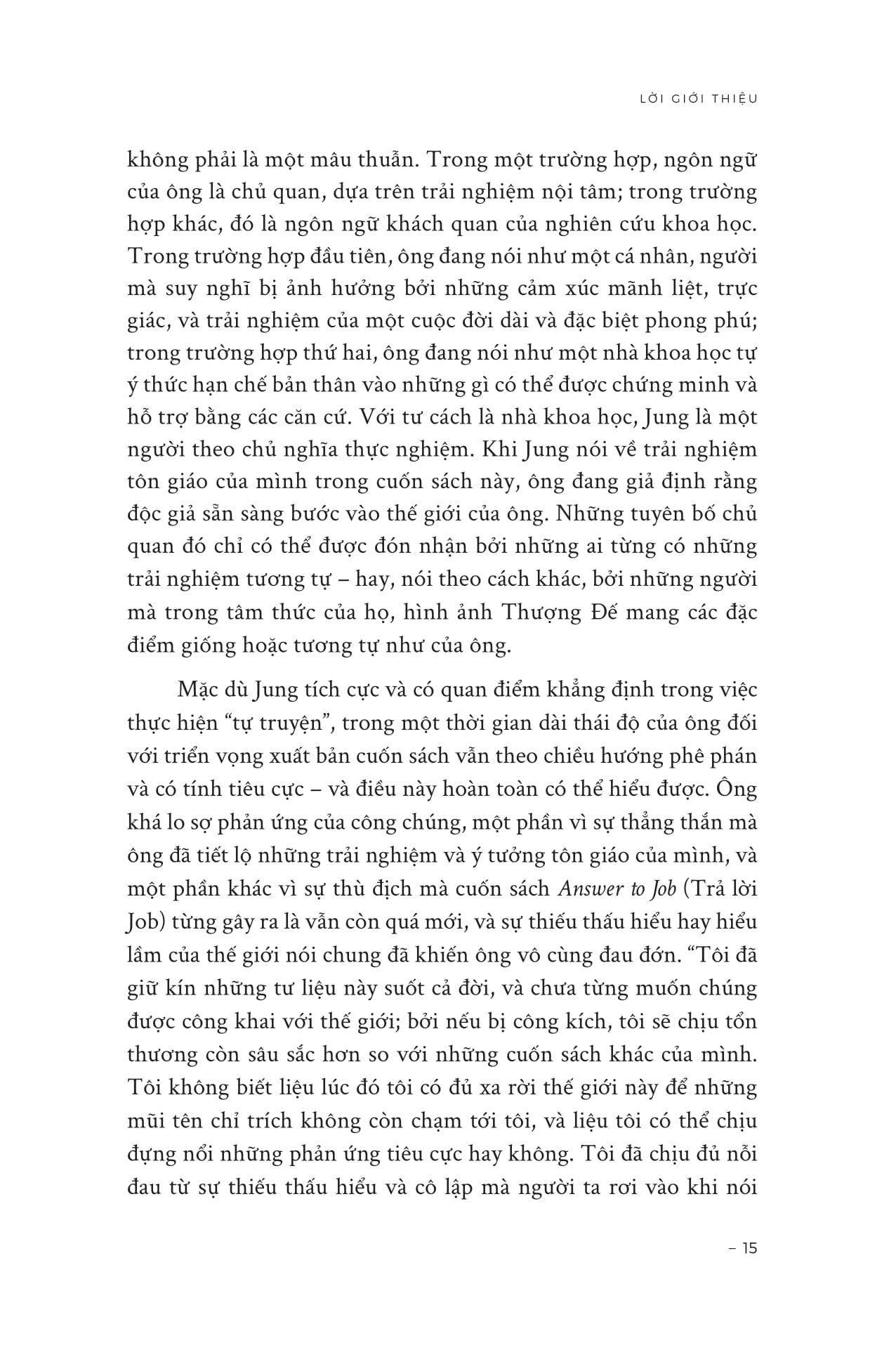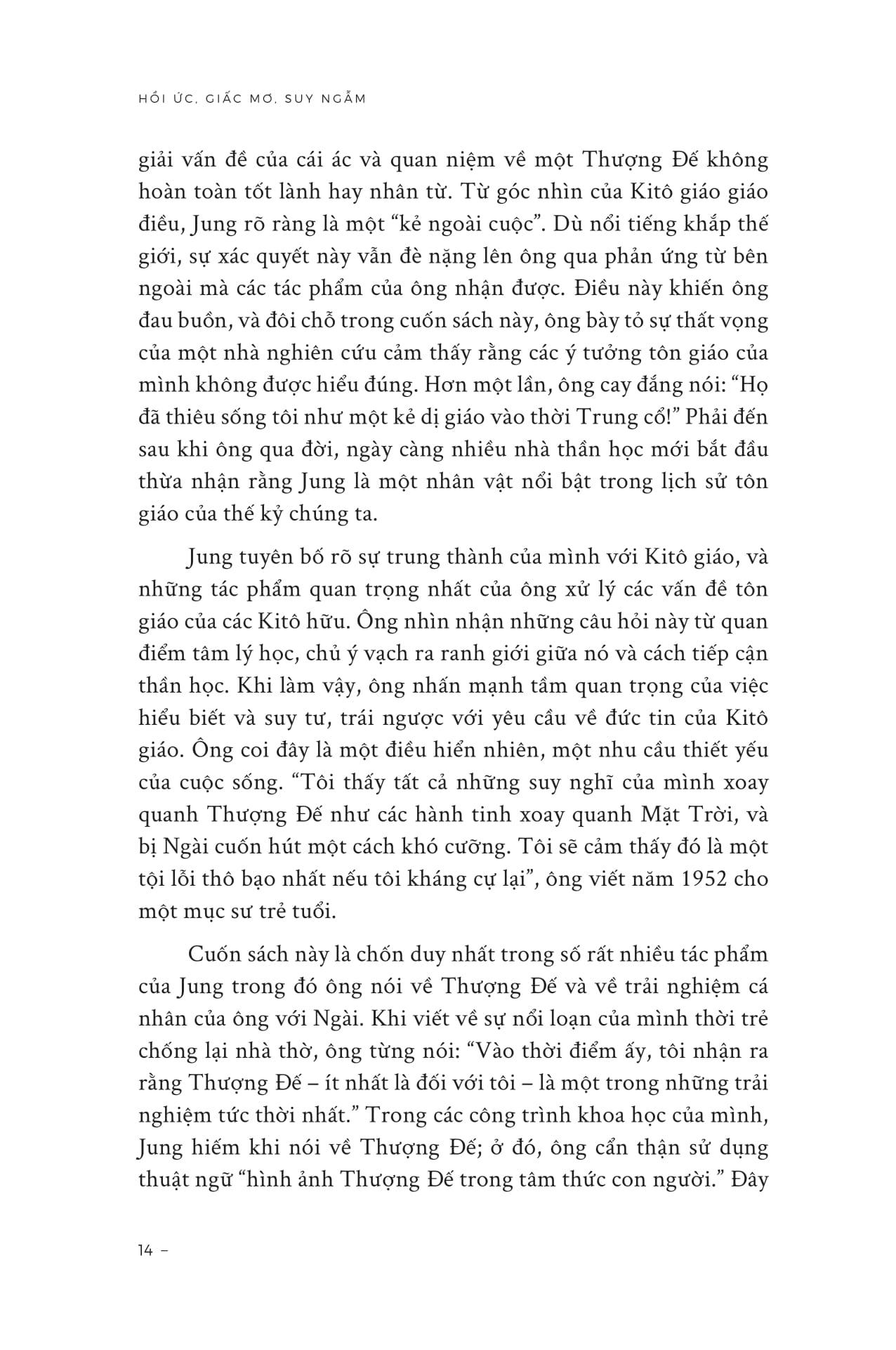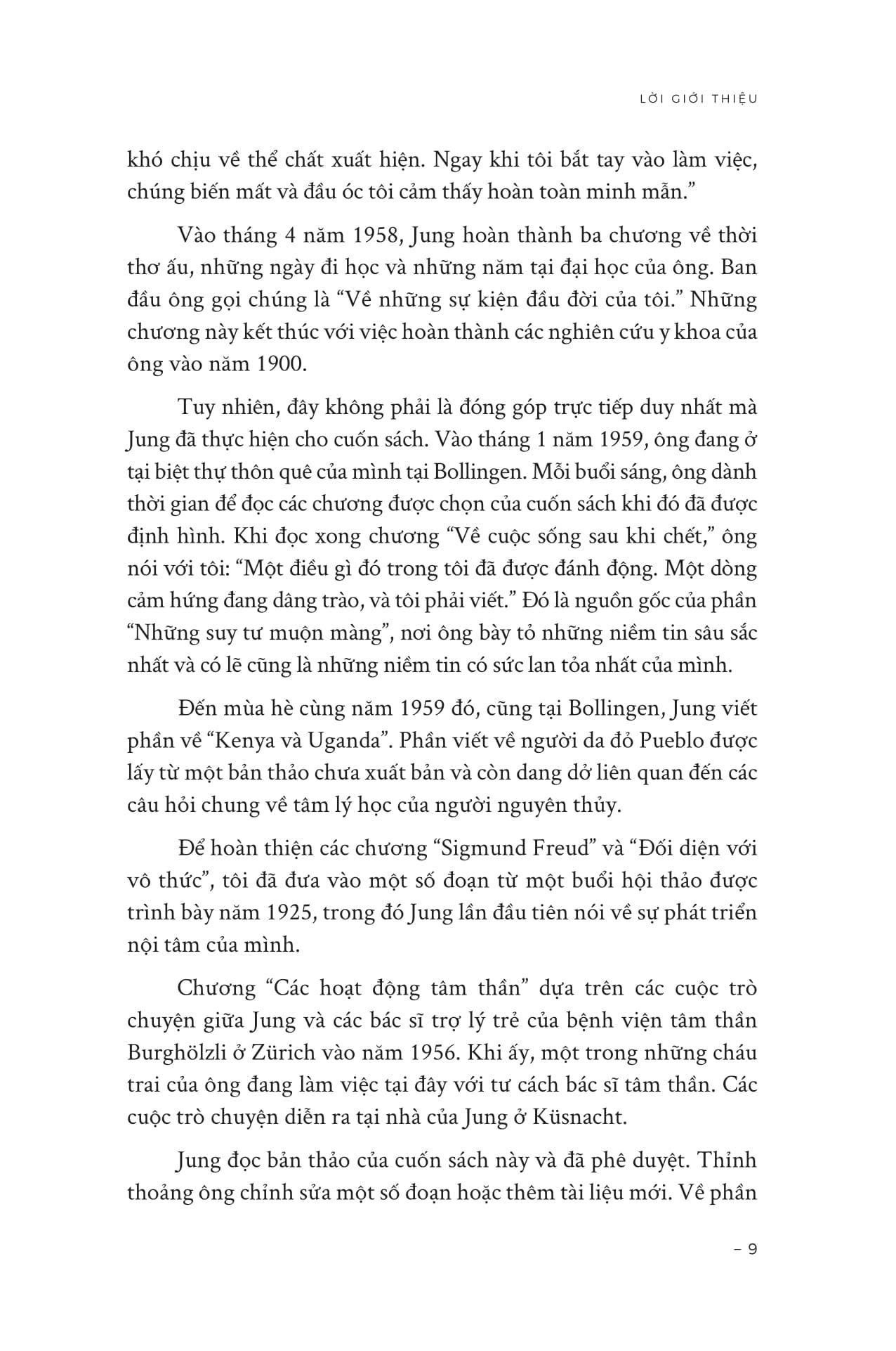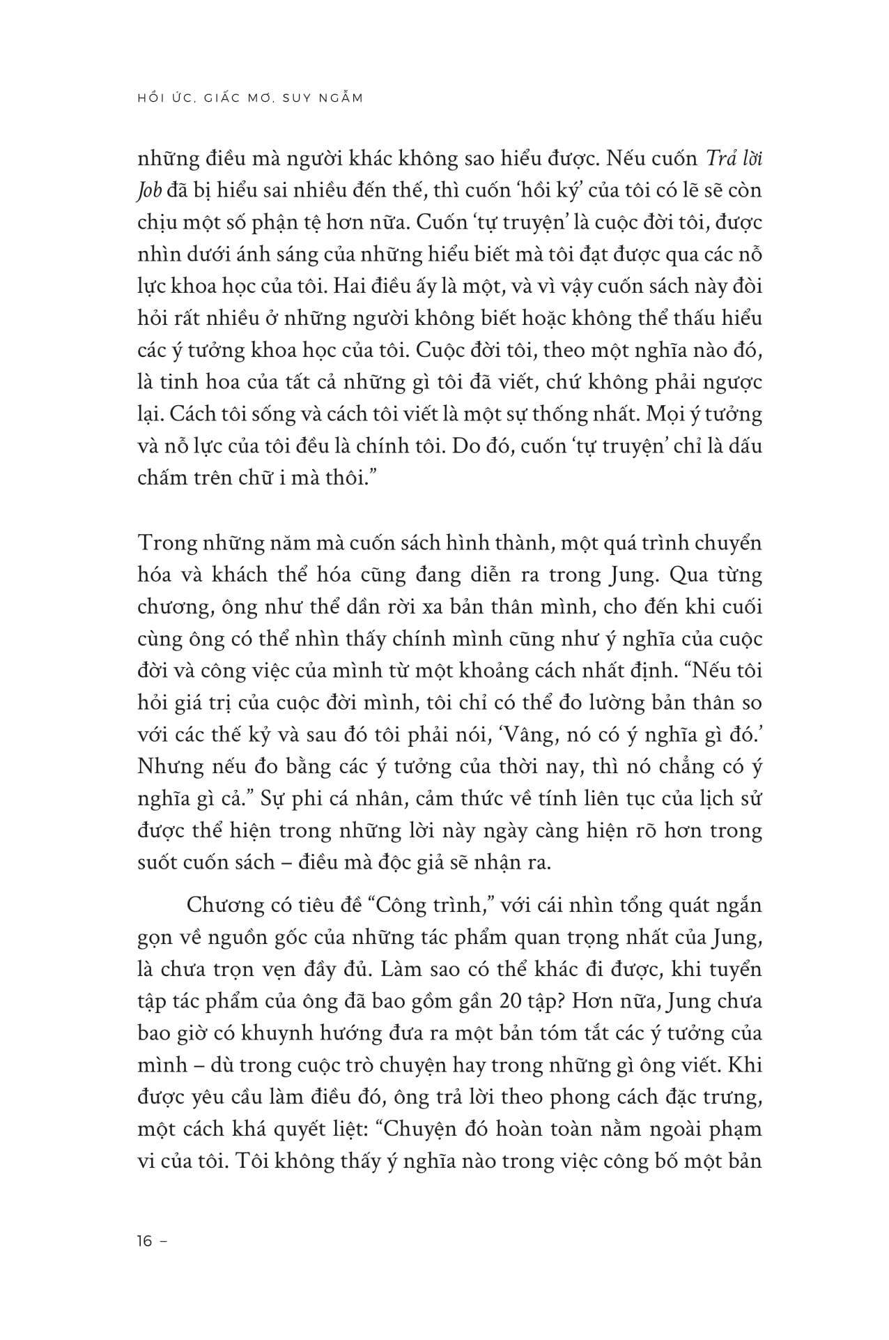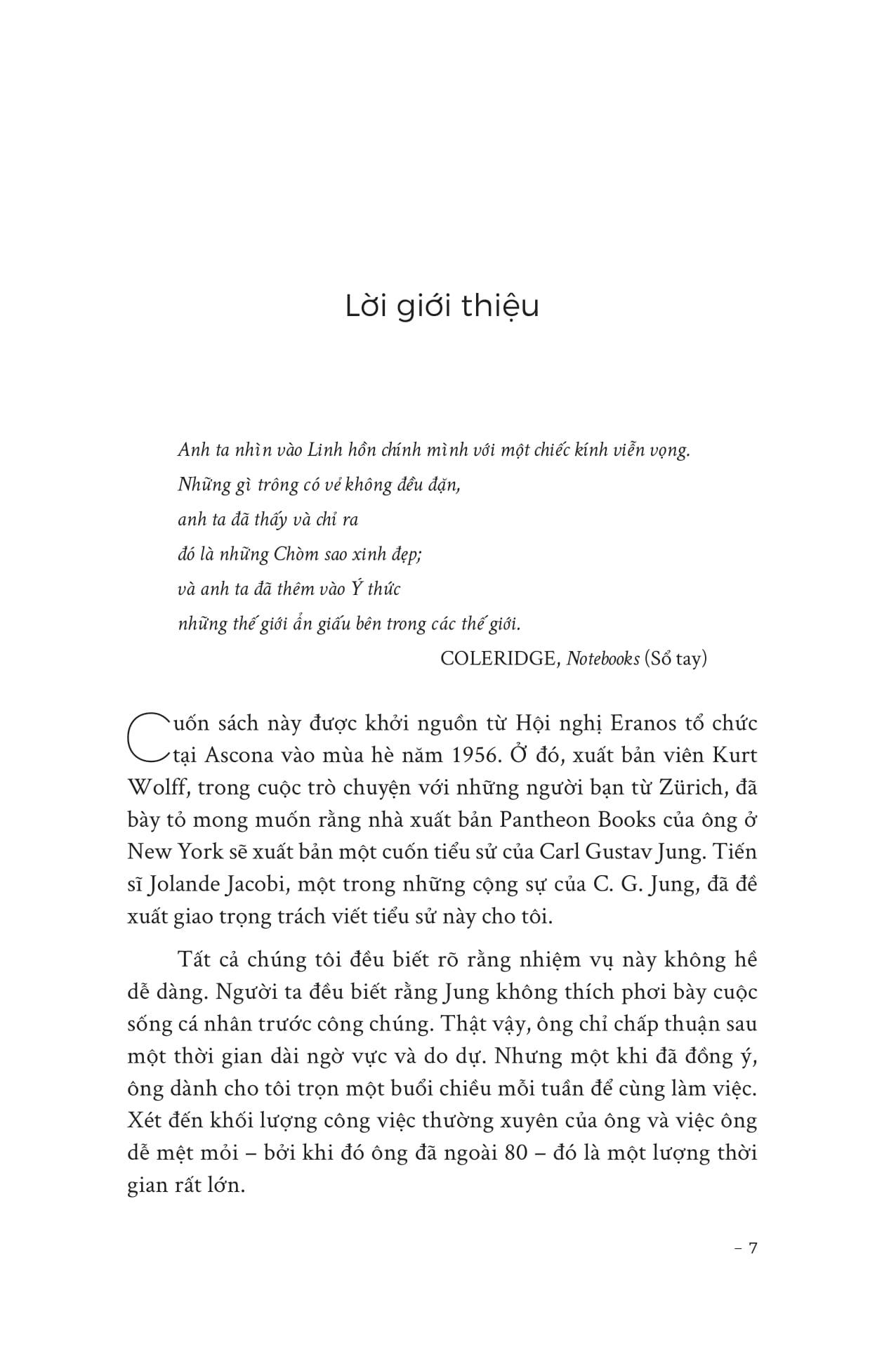 BỐ CỤC CUỐN SÁCH: Lời giới thiệu Lời nói đầu I. Những năm đầu đời II. Thời học sinh III. Thời sinh viên IV. Các hoạt động tâm thần học V. Sigmund Freud VI. Đối diện với vô thức VII. Công trình VIII. Tháp IX. Những chuyến du hành X. Thị kiến XI. Về cuộc sống sau cái chết XII. Những suy tư muộn màng Suy ngẫm Phụ lục Chú giải thuật ngữ Mục từ tra cứu THÔNG TIN TÁC GIẢ: Carl Gustav Jung (1875 – 1961) Nhà tâm lý học lớn, có ảnh hưởng sâu rộng đến nhiều lĩnh vực khoa học khác nhau. Ông là bác sĩ tâm thần tiên phong, người sáng lập ra trường phái Tâm lý học phân tích (còn gọi là Tâm lý học chiều sâu), một nhánh quan trọng được phát triển từ phân tâm học [của S. Freud], đồng thời cũng góp phần định hình lại cách chúng ta nhìn nhận về thần kinh học thông qua những khám phá về các khía cạnh tâm thức sâu xa. Jung nổi tiếng với các nghiên cứu về vô thức tập thể và nguyên mẫu, những khái niệm đã cách mạng hóa hiểu biết của chúng ta về bản chất con người, huyền thoại và biểu tượng. Sự nghiệp khoa học của ông tập trung vào quá trình cá nhân hóa, hành trình tìm kiếm sự toàn vẹn của bản thân, cũng như mối liên hệ giữa các truyền thống tâm linh cổ xưa với tâm lý học hiện đại. Tác phẩm nổi bật: Psychological Types (Các loại hình Tâm lý), 1921 Aion: Researches into the Phenomenology of the Self (Nghiên cứu về Hiện tượng học của cái Tôi toàn thể), 1951 Memories, Dreams, Reflections (Hồi ức, Giấc mơ, Suy ngẫm), 1961 Red Books (Sách Đỏ), 2009 TRÍCH ĐOẠN/ CÂU QUOTE HAY Dù là những cá nhân riêng biệt, con người chúng ta, ở một mức độ lớn, vẫn là đại diện, là nạn nhân và là tác nhân của một tinh thần tập thể có tuổi đời tính bằng thế kỷ. Ta có thể tưởng rằng suốt đời được tự làm theo ý m.ình, và có thể chẳng bao giờ nhận ra phần lớn thời gian ta chỉ là vai phụ trên sân khấu của vở kịch thế gian. Có những yếu tố, dù ta không biết đến, vẫn ảnh hưởng đến đời ta – và càng mạnh hơn nếu chúng nằm trong vô thức. — Chương III Tôi không có ý định, cũng chẳng đủ khả năng, để đứng ngoài bản thân và quan sát số phận của m.ình một cách thật sự khách quan. Nếu làm vậy, tôi sẽ phạm sai lầm thường thấy trong các hồi ký – hoặc dệt nên một ảo tưởng về cách lẽ ra mọi chuyện nên xảy ra, hoặc viết ra một lời biện hộ cho đời m.ình. Rốt cuộc, con người là một hiện tượng không thể tự phán xét m.ình, và việc này, dù tốt hay xấu, vẫn phải giao cho người khác nhận định. — Chương III Trong nhiều trường hợp tâm thần học, bệnh nhân đến với chúng tôi luôn mang theo một câu chuyện chưa từng được kể – và thường thì chẳng ai biết đến câu chuyện đó. Theo tôi, việc đ.iều trị thực sự chỉ có thể bắt đầu sau khi ta khám phá được câu chuyện cá nhân đó. Đó là bí mật của bệnh nhân, là tảng đá mà họ va phải và vỡ tan. Nếu tôi biết được câu chuyện bí mật ấy, tôi có trong tay chiếc chìa khóa để đ.iều trị. Nhiệm vụ của bác sĩ là tìm ra cách để đạt tới tri thức đó. Trong đa số trường hợp, chỉ khai thác phần ý thức là không đủ. Đôi khi một bài kiểm tra liên tưởng có thể mở đường; cũng có thể là việc giải mã giấc mơ, hoặc một mối quan hệ kiên nhẫn, lâu dài với bệnh nhân như giữa người với người. Trong đ.iều trị, vấn đề luôn luôn là con người toàn vẹn – không bao giờ chỉ là triệu chứng đơn lẻ. Chúng ta phải đặt ra những câu hỏi thách thức nhân cách toàn diện. — Chương IV Tâm thức phức tạp hơn và khó tiếp cận hơn cơ thể rất nhiều. Có thể nói rằng, nó là một nửa thế giới – nửa chỉ thực sự tồn tại khi ta nhận thức được nó. Vì lý do đó, tâm thức không chỉ là vấn đề cá nhân mà còn là vấn đề của cả thế giới, và nhà tâm thần học phải đối mặt với cả một thế giới. — Chương IV Với tôi, một chân lý khoa học là một giả thuyết có thể tạm thời xem là phù hợp, nhưng không bao giờ được coi là một giáo lý vĩnh cửu. — Chương V Rốt cuộc, người nghệ sĩ hiện đại luôn muốn sáng tạo nghệ thuật từ vô thức. — Chương VI [...] không có lịch sử thì không thể có tâm lý học – và chắc chắn là không thể có tâm lý học về vô thức. — Chương VII Cuộc đời tôi đã được xuyên thấu và gắn kết lại bởi một ý tưởng và một mục tiêu duy nhất: đó là đi sâu vào bí mật của nhân cách. Mọi thứ đều có thể được giải thích từ điểm trung tâm ấy, và tất cả các công trình của tôi đều liên quan đến chủ đề duy nhất này. — Chương VII Mọi phán đoán của một cá nhân đều chịu ảnh hưởng bởi kiểu nhân cách của anh ta, và rằng mọi quan điểm đều tất yếu là tương đối. — Chương VII Khi một nhà vật lý nói rằng nguyên tử có cấu tạo như thế này hay thế kia, và vẽ một mô hình về nó, ông ta không hề có ý nói ra một chân lý vĩnh cửu. Nhưng các nhà thần học lại không hiểu 