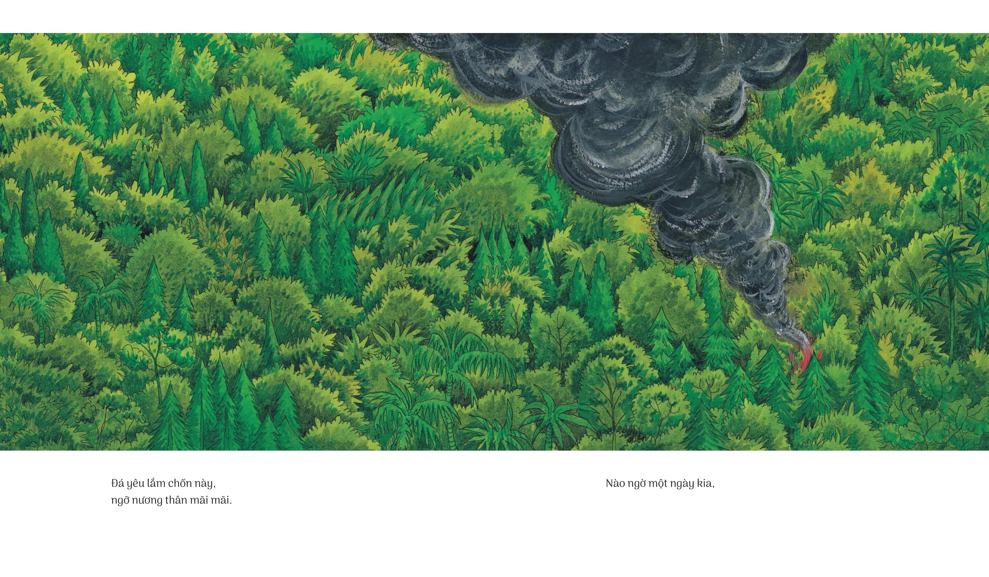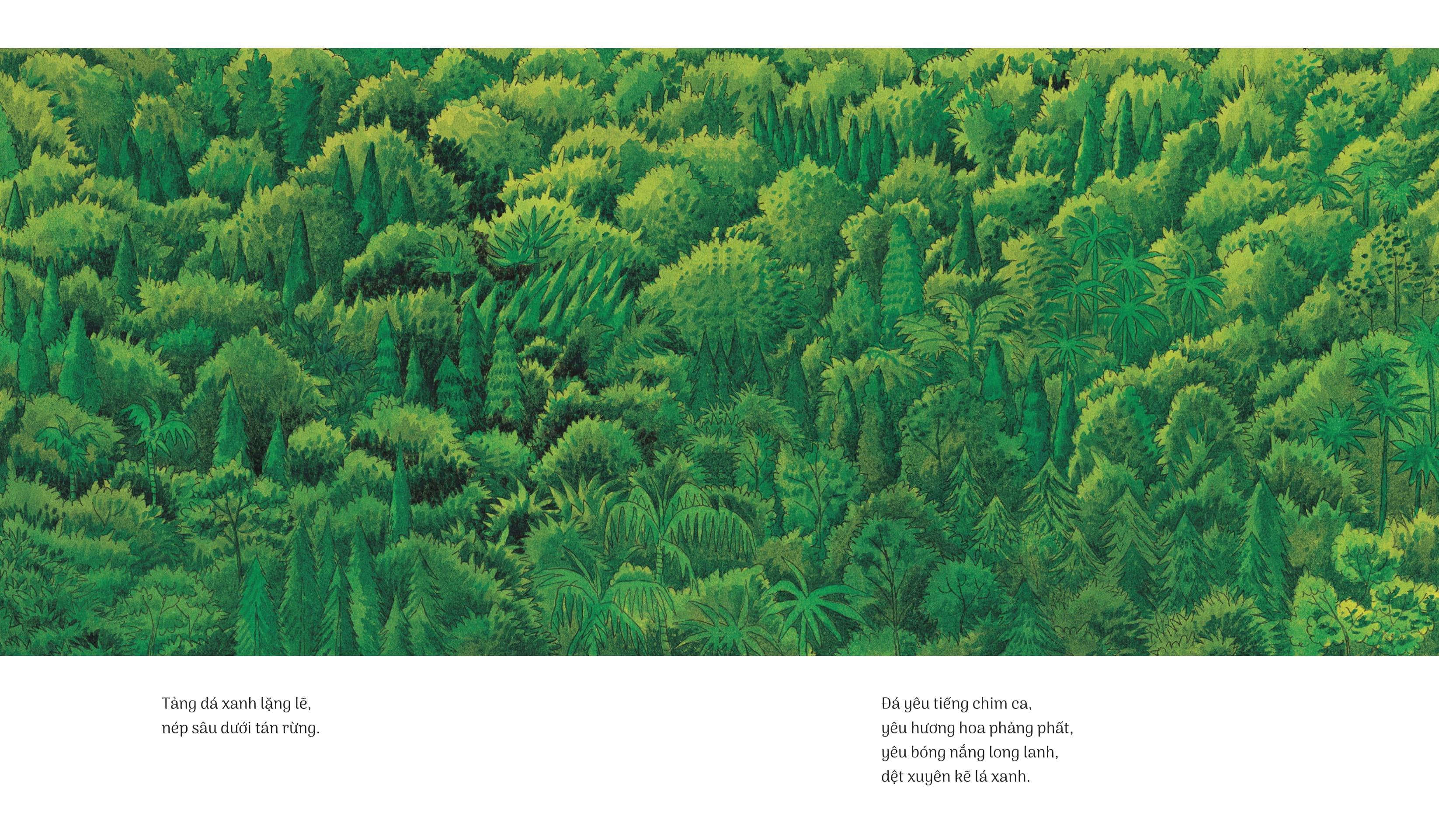 Hòn Đá Xanh Có một hòn đá xanh sống bình lặng trong rừng sâu. Bỗng một ngày, sau trận cháy, nó bị bửa đôi, một nửa bị mang ra khỏi rừng. Nó khôn nguôi nhớ
