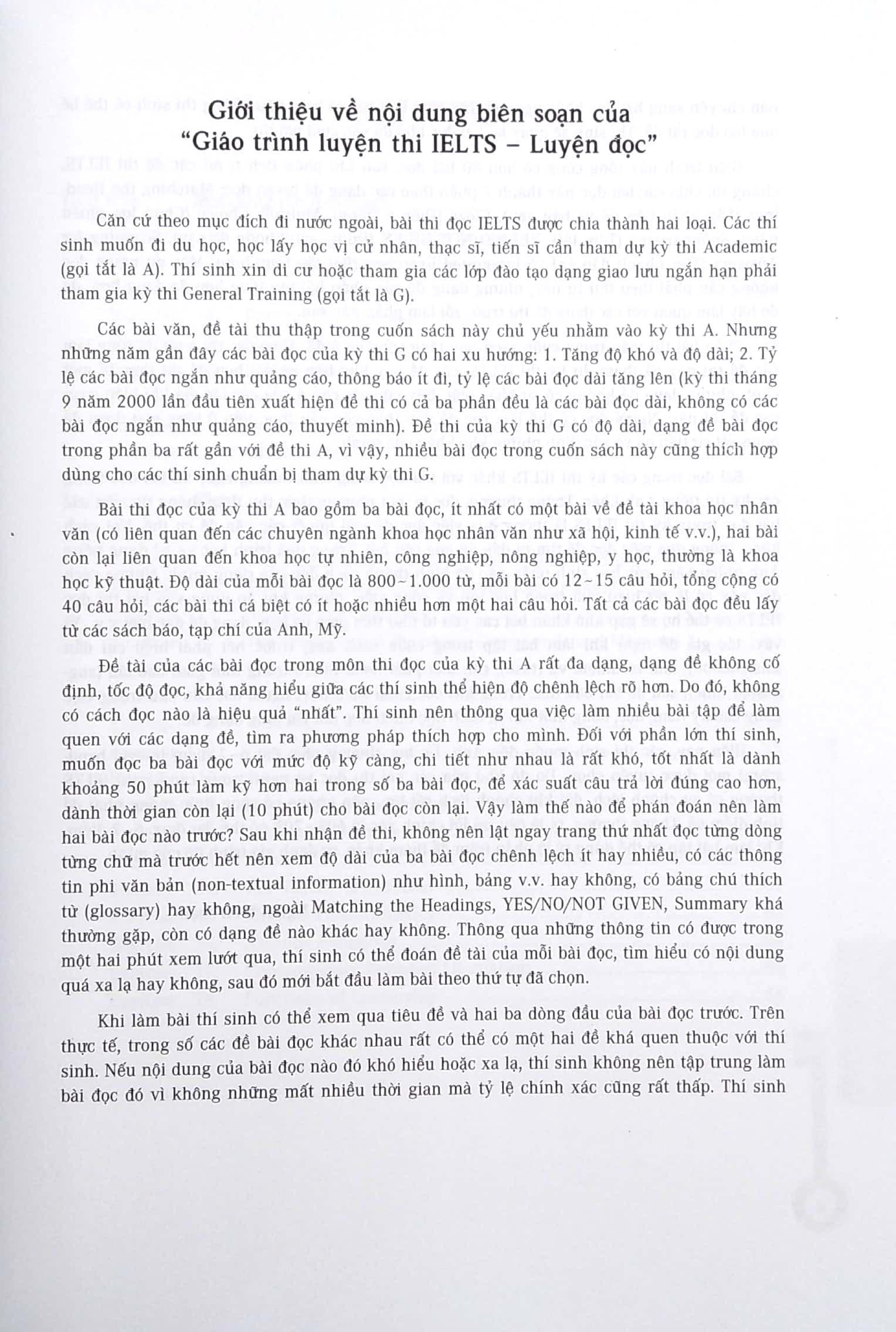 Bài đọc trong các kỳ thi IELTS khác với bài đọc tiếng Anh thường ngày và bài đọc trong các kỳ thi tiếng Anh khác. Thông thường, đọc là một phương thức thu thập thông tin, còn các bài đọc trong kỳ thi IELTS là thông qua việc đọc để giải quyết các vấn đề cụ thể. Nó cách khác, thông qua việc đọc để tìm ra đáp án của câu hỏi. Trong quá trình học và sử dụng tiếng Anh nhiều năm, các họ sinh phần nào hình thành các đọc riêng của m.ình. Những cách đọc này có lẽ rất hiệu quả trong học tập và công việc, nhưng khi áp dụng vào bài thi đọc IELTS có thể họ sẽ gặp khó khăn bởi các yếu tố như thời gian có hạn, dạng đề đặc biệt …. Vì vậy, tác giả đề nghị khi làm bài tập trong cuốn sách này, trước hết phải hiểu chỉ dẫn (instruction), làm rõ nhiệm vụ (task), cần biết phải hoàn thành trong thời gian bao lâu (suggested time), sau đó bắt đầu đọc. Trong cuốn sách này, người đọc cần chú trông việc nâng cao kỹ năng đọc, đồng thời tìm ra cách đọc thích hợp với từng dạng đề.