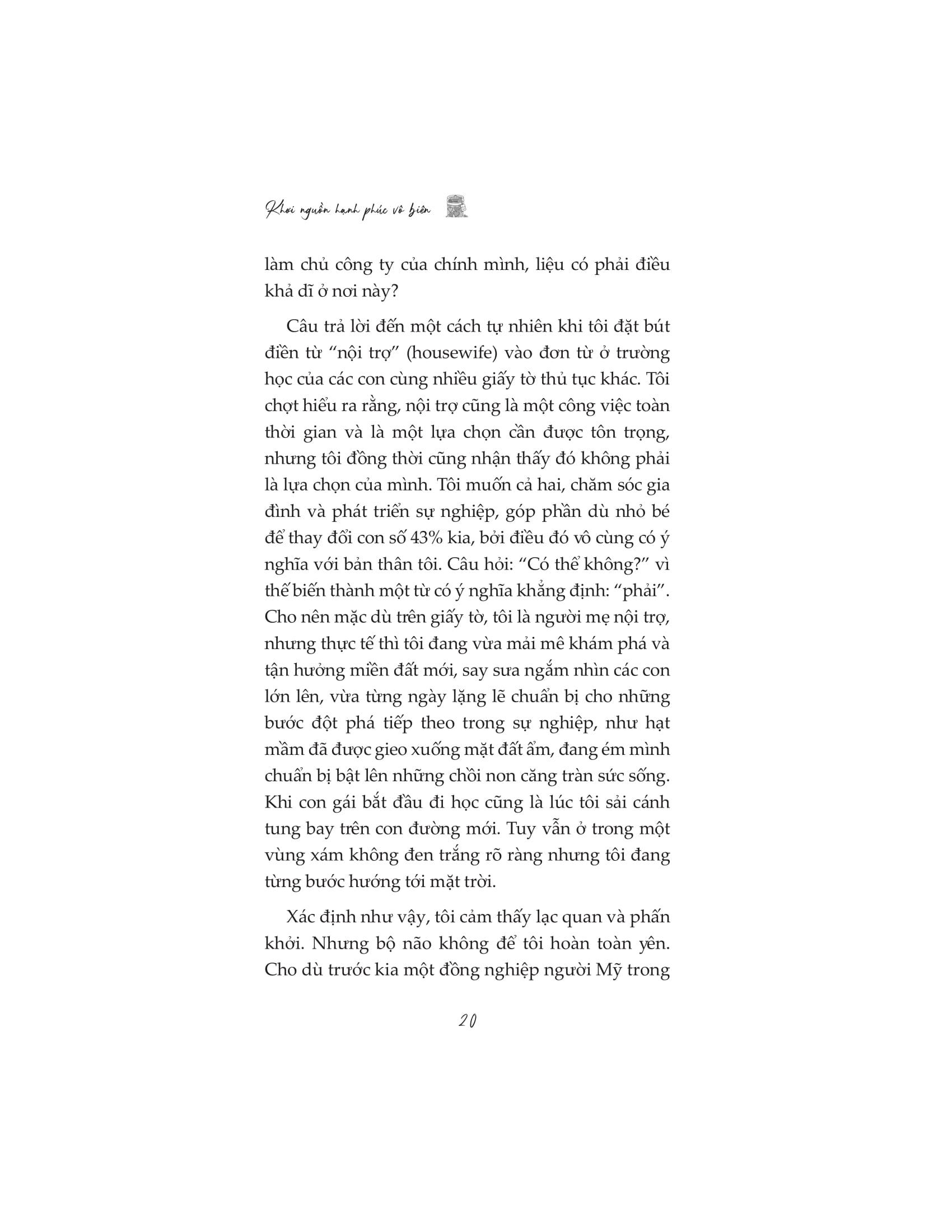Khơi Nguồn Hạnh Phúc Vô Biên Ở tuổi 32, Amy Nguyễn nghĩ rằng cô đã có đủ mọi thứ: vị trí Trưởng bộ phận Hạnh phúc Nhân viên tại một tập đoàn kỳ lân, một người chồng yêu thương, hai con một trai một gái khỏe mạnh, một căn hộ êm đềm ở quốc đảo Singapore tươi đẹp, và một cô giúp việc đáng tin cậy. Tuy nhiên, trở lại công việc sau kỳ nghỉ sinh, trong khi chỉ số hạnh phúc của nhân viên đi lên thì chỉ số hạnh phúc của chính cô xuống dốc không phanh. Cho đến một ngày cô vỡ òa và tự hỏi: Liệu một người mẹ có thể có được hạnh phúc đích thực, trong cả sự nghiệp, gia đình và cuộc sống mà không cần phải lựa chọn hay không? Ít lâu sau, cô đã bỏ việc để bắt đầu hành trình đi tìm ra câu trả lời. Và trong hành trình ấy sẽ được Amy ghi lại trong cuốn sách "KHƠI NGUỒN HẠNH PHÚC VÔ BIÊN" - cuốn sách mà chính bản thân tác giả đã "mang bầu" và "thai nghén" suốt 5 năm trời. Cuốn sách với sứ mệnh đồng hành cùng các cha mẹ, nhất là các mẹ, trong hành trình nâng tầm hạnh phúc của riêng m.ình. Cuốn sách mở ra một góc nhìn mới về hạnh phúc: Hạnh phúc không đến từ việc có tất cả, mà đến từ cách bạn lựa chọn và tận hưởng những gì m.ình đang có. Với những nghiên cứu sâu sắc về khoa học não bộ, tác giả Amy giúp bạn hiểu cách kiểm soát căng thẳng, nuôi dưỡng một tư duy tích cực và ứng dụng những công cụ thực tế để xây dựng một cuộc sống cân bằng. Bạn sẽ không chỉ đọc một câu chuyện, mà còn tìm thấy chính m.ình trong từng trang sách. Bạn sẽ học cách sắp xếp lại cuộc sống, học cách lắng nghe chính m.ình, và quan trọng nhất – học cách yêu thương bản thân mà không cảm thấy có lỗi. Chúng ta, những người phụ nữ, không sinh ra để sống trong những khuôn khổ hay giới hạn mà xã hội vô tình đặt lên vai. Chúng ta không chỉ là những người mẹ tận tụy, những người vợ hết lòng, hay những nhân viên chăm chỉ – chúng ta là những con người độc lập, có khát khao, có ước mơ, có quyền được sống một cuộc đời trọn vẹn. VỀ TÁC GIẢ Amy Nguyễn là Chiến lược gia và Coach về Hạnh phúc Sự nghiệp – Cuộc sống. Cô đã hỗ trợ những người mẹ đến từ hơn 10 quốc gia từ châu Á, châu Âu và Mỹ bứt phá và nâng tầm hạnh phúc trong sự nghiệp và cuộc sống. Cô được cấp chứng chỉ là brain-based coach bởi Viện Neuroership có trụ sở tại New York, và là thành viên chính thức của Hội đồng Coaches của Forbes từ 2018 – 2022. Năm 2020, cô được tờ Business Insider đưa vào danh sách Most Innovative Coach trên toàn cầu và vào năm 2021, cô đồng thời được lọt vào vòng bán kết của danh sách Forbes Next 1000 dành cho những entrepreneur vẫn trụ vững trong mùa Covid. Cô cũng là diễn giả về hạnh phúc cho các tổ chức trong đó có IBM, WeWork, Hudson Montessori, Ellevate Network. Chia sẻ chuyên môn cũng như câu chuyện của Amy đã xuất hiện trên Forbes, Business Insider, NBC, Vietcetera và các ấn phẩm khác.