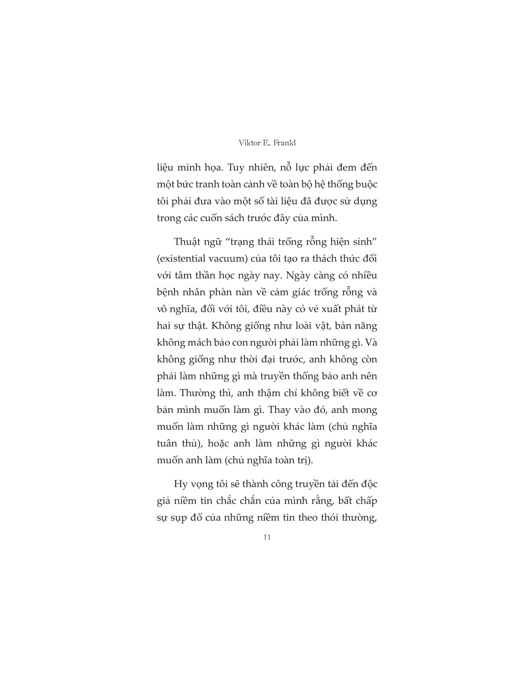 Khủng Hoảng Hiện Sinh Chắc hẳn, ai trong chúng ta cũng từng rơi vào trạng thái trống rỗng hiện sinh, một trạng thái mà ta không tìm ra được lẽ sống của cuộc đời m.ình, không biết được chân lý cuộc sống mà m.ình đang theo đuổi là gì. Tình trạng này ngày càng phổ biến trong xã hội hiện đại, khi mà chúng ta bị choáng ngợp bởi những luồng thông tin, hình ảnh trên mạng xã hội và hội chứng sợ bỏ lỡ (FOMO). Trong cuốn sách Khủng hoảng hiện sinh - nhà thần kinh học người Áo Viktor E. Frankl đã hướng dẫn liệu pháp trị liệu tâm lý mang tên “liệu pháp ý nghĩa”. Ông quan niệm rằng, cuộc đời của ai cũng có một lẽ sống. Cuốn sách sẽ là một bức tranh toàn cảnh về những nguyên lý, tổng hợp tài liệu minh họa hình ảnh và những câu chuyện thực tế xoay quanh liệu pháp này. Viktor muốn truyền tải một niềm tin chắc chắn rằng, bất chấp sự sụp đổ của những lý lẽ thông thường, cuộc sống của mỗi người đều có những ý nghĩa riêng, và ý nghĩa đó vẫn sẽ luôn vẹn nguyên cho đến khi ta trút hơi thở cuối cùng. Cuốn sách này giúp bạn: