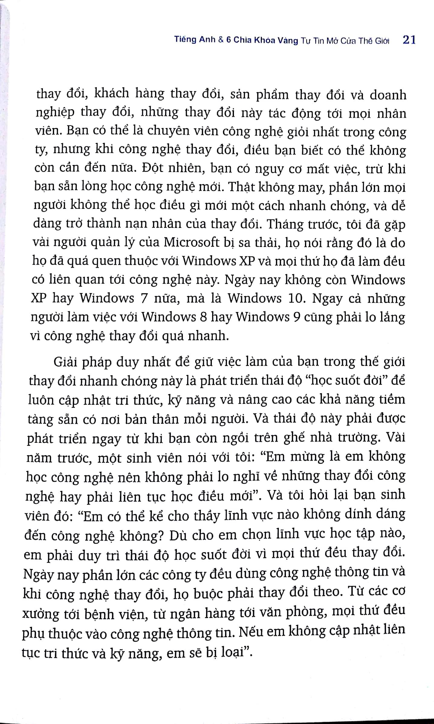 Với 6 kỹ năng vàng trong cuốn sách: Kỹ năng giao tiếp; Kỹ năng hợp tác; Kỹ năng sang tạo; Tư duy sáng tạo; Tư duy phản biện; Năng lực tự hoàn thiện bản thân; Kiến thức công nghệ, sẽ là chìa khóa để bạn mở ra mọi vấn đề cần thiết đối với một người trẻ đang chuẩn bị hành trang bước vào xây dựng sự nghiệp. Những kiến thức đó không chỉ dành cho thanh niên Việt Nam hay một quốc gia nào mà cho tất cả. Trong một thế giới phẳng, cạnh tranh giữa những cá nhân là toàn cầu chứ không riêng bối cảnh một quốc gia. Vì tính ứng dụng cao như thế nên quyển sách là món quà quý cho thanh niên Việt Nam.