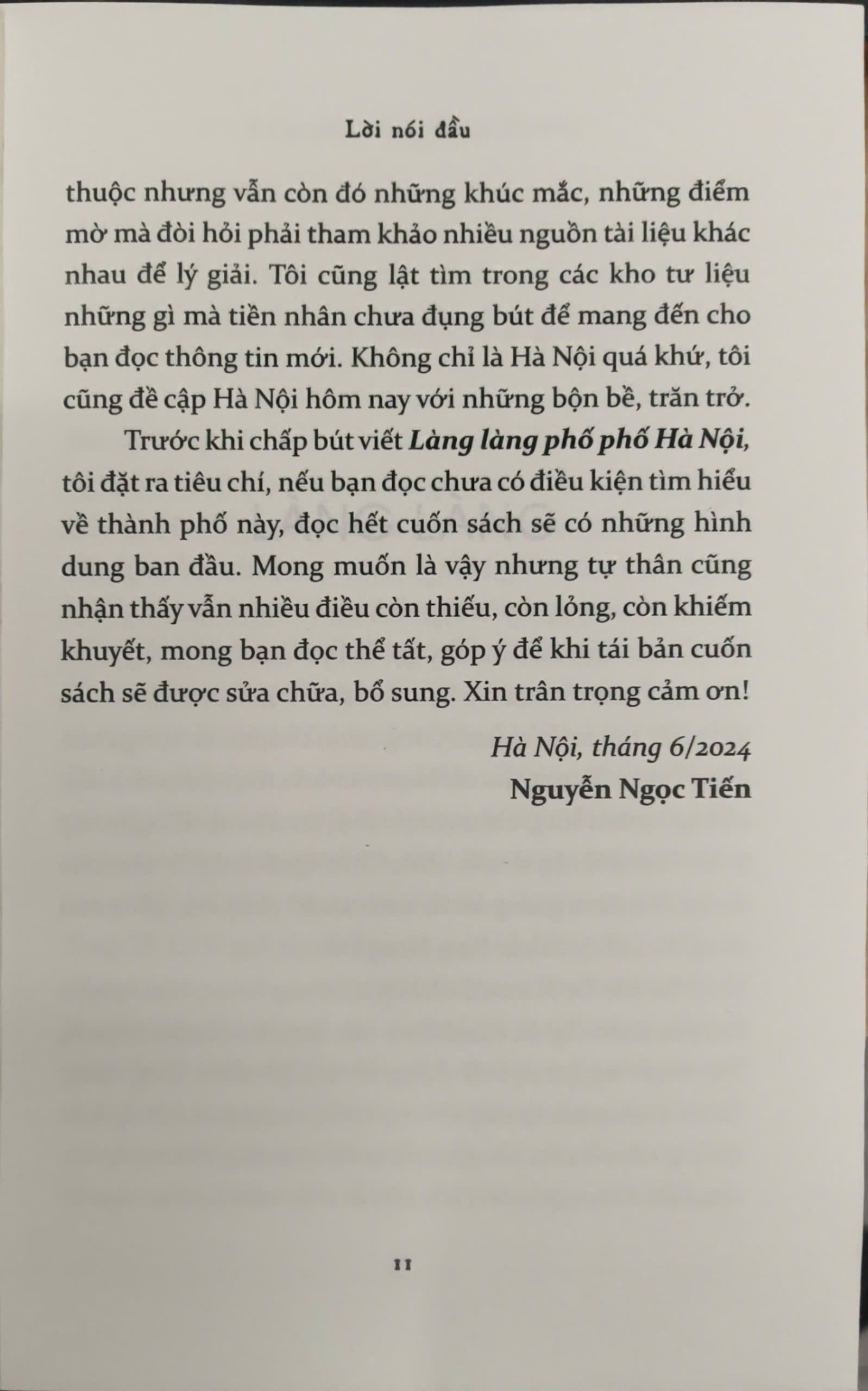 Đối với Nguyễn Ngọc Tiến, Hà Nội đã không còn xa lạ, nếu không muốn nói đã “nhẵn mặt” trong các trang viết của ông. Những mỗi lần đi, thấy và viết về Hà Nội, Nguyễn Ngọc Tiến luôn gợi mở những góc nhìn rất mới, rất lạ và thú vị. Trong cuốn sách lần này, “Làng làng phố phố Hà Nội”, đó là hình ảnh của một thành phố vừa quê mùa, cổ kính với các lễ hội, các làng nghề truyền thống, vừa hiện đại, phồn hoa khi từng là kinh đô của các triều đại phong kiến, là thủ phủ của Liên bang Đông Dương thuộc Pháp, và là thủ đô của nước Việt Nam hôm nay. Làng và phố vừa tương phản với nhau, vừa song song tồn tại làm nên diện mạo rất đặc biệt của Hà Nội, mà nếu thiếu đi một, hoặc nếu cố tình loại bỏ một, thì đó không còn là Hà Nội