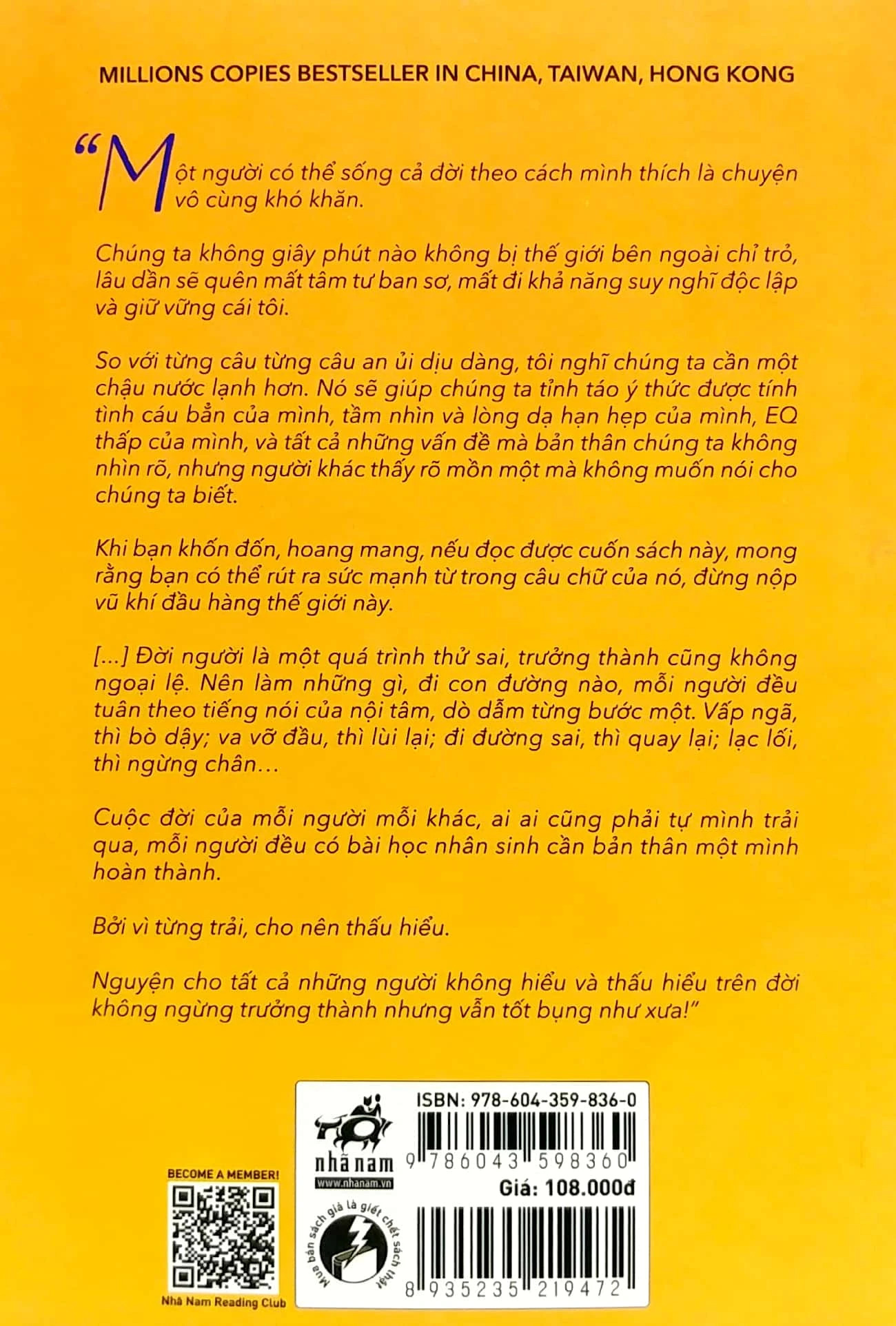“Một người có thể sống cả đời theo cách mình thích là chuyện vô cùng khó khăn. Chúng ta không giây phút nào không bị thế giới bên ngoài chỉ trỏ, lâu dần sẽ quên mất tâm tư ban sơ, mất đi khả năng suy nghĩ độc lập và giữ vững cái tôi. So với từng câu từng câu an ủi dịu dàng, tôi nghĩ chúng ta cần một chậu nước lạnh hơn. Nó sẽ giúp chúng ta tỉnh táo ý thức được tính tình cáu bẳn của mình, tầm nhìn và lòng dạ hạn hẹp của mình, EQ thấp của mình, và tất cả những vấn đề mà bản thân chúng ta không nhìn rõ, nhưng người khác thấy rõ mồn một mà không muốn nói cho chúng ta biết. Khi bạn khốn đốn, hoang mang, nếu đọc được cuốn sách này, mong rằng bạn có thể rút ra sức mạnh từ trong câu chữ của nó, đừng nộp vũ khí đầu hàng thế giới này. [] Đời người là một quá trình thử sai, trưởng thành cũng không ngoại lệ. Nên làm những gì, đi con đường nào, mỗi người đều tuân theo tiếng nói của nội tâm, dò dẫm từng bước một. Vấp ngã, thì bò dậy; va vỡ đầu, thì lùi lại; đi đường sai, thì quay lại; lạc lối, thì ngừng chân… Cuộc đời của mỗi người mỗi khác, ai ai cũng phải tự mình trải qua, mỗi người đều có bài học nhân sinh cần bản thân một mình hoàn thành. Bởi vì từng trải, cho nên thấu hiểu. Nguyện cho tất cả những người không hiểu và thấu hiểu trên đời không ngừng trưởng thành nhưng vẫn tốt bụng như xưa!” ———— 2H Books – Delivering Happiness… 2H Books là công ty trực thuộc Công ty cổ phần văn hóa Huy Hoàng. Chúng tôi cung cấp các đầu sách uy tín, đã được chọn lọc trên thị trường.