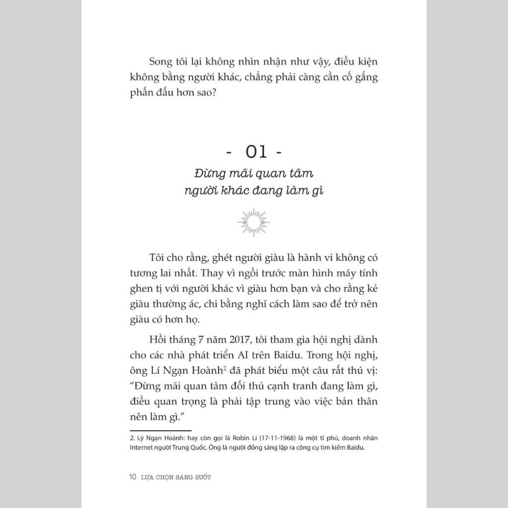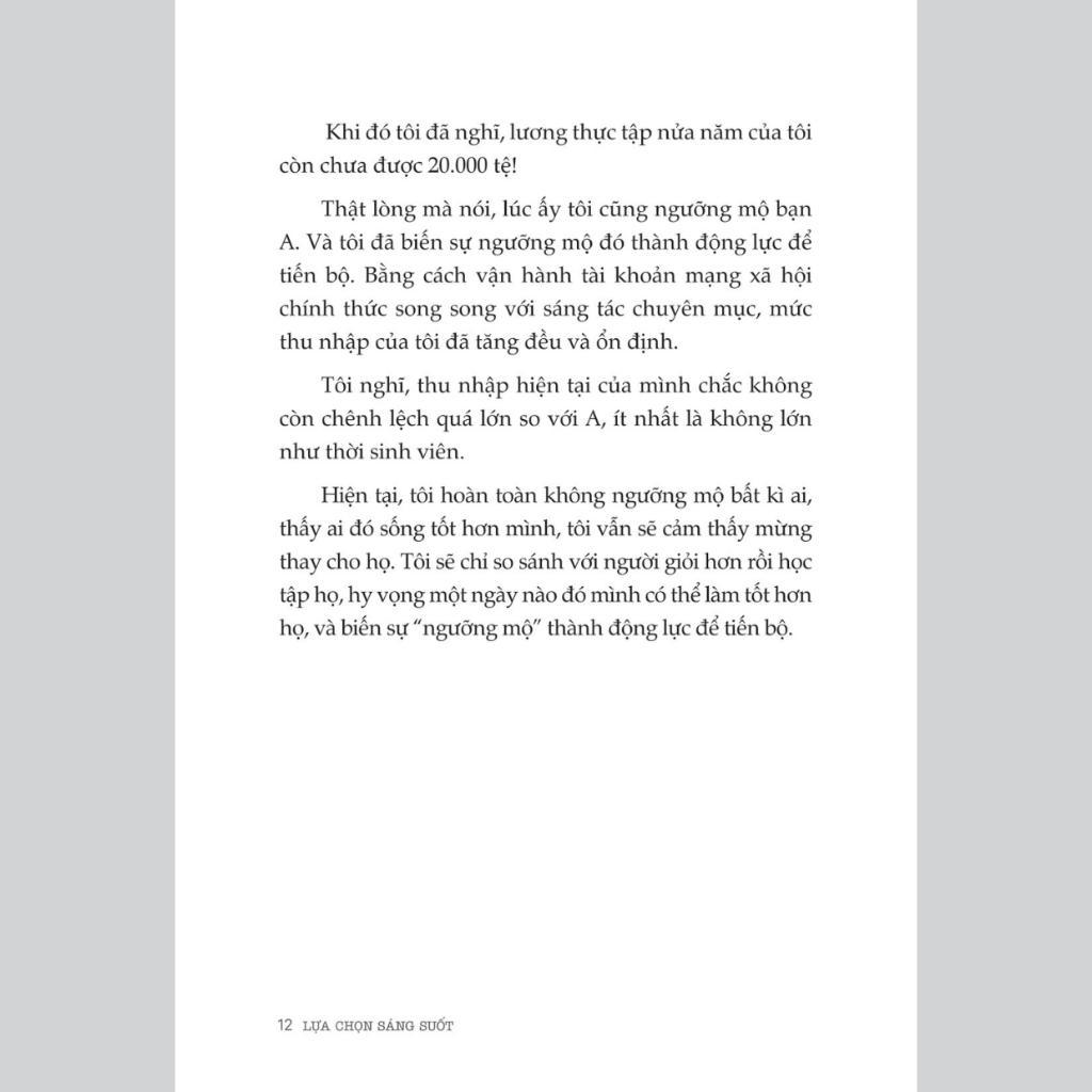 “Lựa chọn sáng suốt - Bước đệm cho sự trưởng thành” sẽ là cuốn sách không thể thiếu trên hành trình thay đổi để trở thành phiên bản tốt hơn của bản thân. Trong cuốn sách này, tác giả đưa ra rất nhiều những bài học làm hành trang để có những lựa chọn sáng suốt trên đường đời: Phát triển định hướng, học về kỹ năng, học về cách đối diện với bản thân, học cách làm chủ tư duy, loại bỏ những lối mòn…