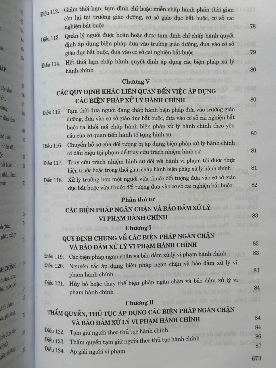Luật gồm: – Những quy định chung – Xử phạt vi phạm hành chính – Áp dụng các biện pháp xử lý hành chính – Các biện pháp ngăn chặn và bảo đảm xử lý