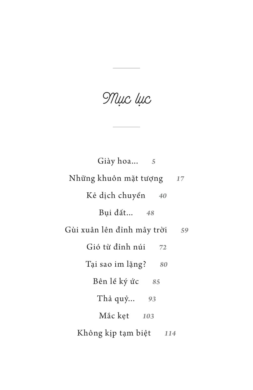 Tập truyện gồm các truyện ngắn: Giày hoa, Những khuôn mặt tượng, Kẻ dịch chuyển, Bụi đất, Gùi xuân lên đỉnh mây trời, Gió từ đỉnh núi, Tại sao im lặng?, Bên lề ký ức, Thả quỷ,...