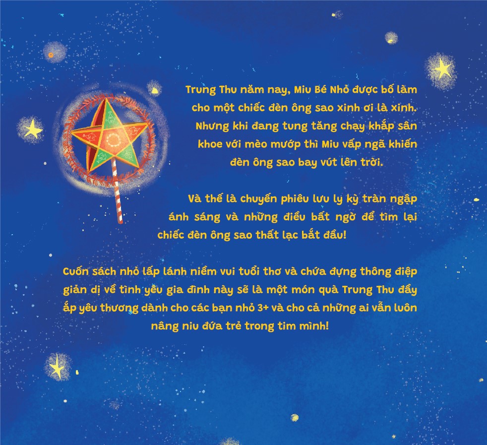 Nhà phát hành: Nhã Nam Nhà xuất bản: Hội Nhà Văn Viết lời: Kawa Minh họa: Mai Anh Đỗ Số trang: 36 Kích thước: 20.5 x 24 cm Trung Thu năm nay, Miu Bé Nhỏ được bố làm cho một chiếc đèn ông sao xinh ơi là xính. Nhưng khi đang tung tăng chạy khắp sân khoe với mèo mướp thì Miu vấp ngã khiến đèn ông sao bay vút lên trời. Và thế là chuyến phiêu lưu ly kỳ tràn ngập ánh sáng và những điều bất ngờ để tìm lại chiếc đèn ông sao thất lạc bắt đầu! Cuốn sách nhỏ lấp lánh niềm vui tuổi thơ và chứa đựng thông điệp giản dị về tình yều gia đình này sẽ là một món quà Trung Thu đầy ắp yêu thương dành cho các bạn nhỏ 3+ và cho cả những ai vẫn luôn nâng niu đứa trẻ trong tim mình!