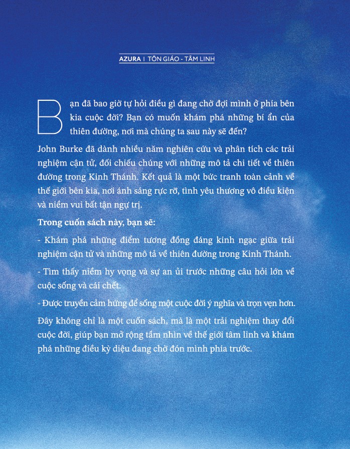 Mua tại TiktokNhà phát hành: Nhã Nam Nhà xuất bản: Thế Giới Tác giả: John Burke Dịch giả: Keo Số trang: 424 Kích thước: 15.5 x 24 cm Bạn đã bao giờ tự hỏi điều gì đang chờ đợi mình ở phía bên kia cuộc đời? Bạn có muốn khám phá những bí ẩn của thiên đường, nơi mà chúng ta sau này sẽ đến? John Burke đã dành nhiều năm nghiên cứu và phân tích các trải nghiệm cận tử, đối chiếu chúng với những mô tả chi tiết về thiên đường trong Kinh Thánh. Kết quả là một bức tranh toàn cảnh về thế giới bên kia, nơi ánh sáng rực rỡ, tình yêu thương vô điều kiện và niềm vui bất tận ngự trị. Trong cuốn sách này, bạn sẽ: Khám phá những điểm tương đồng đáng kinh ngạc giữa trải nghiệm cận tử và những mô tả về thiên đường trong Kinh Thánh.