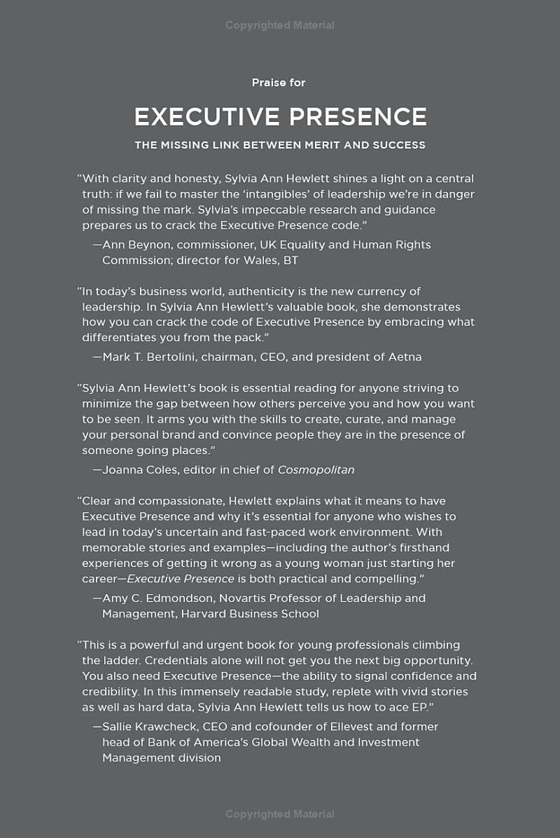 Executive Presence became a classic. Translated into seven languages, it’s helped tens of thousands of ambitious, accomplished professionals to fast-track their careers. Chuck Robbins (CEO of Cisco), and Thasunda Brown Duckett (CEO, TIAA), are among the s who recommend this book for any up-and-comer seeking to rise through the ranks and do something extraordinary with their lives.