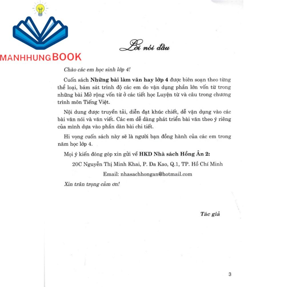 Cuốn sách Những bài làm văn hay lớp 4 được biên soạn theo từng thể loại, bám sát trình độ các em do vận dụng phần lớn vốn từ trong những bài Mở rộng vốn từ ở các tiết học Luyện từ và câu trong chương trình môn Tiếng Việt.