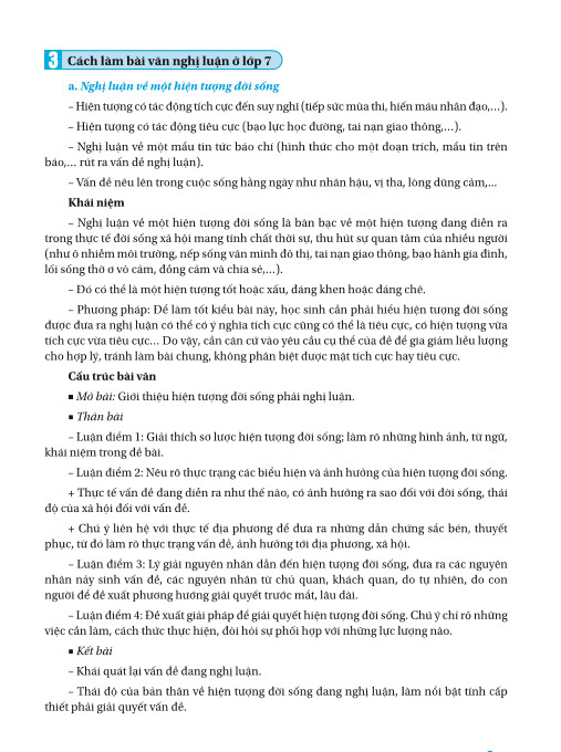 Phần thứ nhất: CÁCH TẠO LẬP CÁC KIỂU VĂN BẢN gồm Tự sự, Miêu tả, Biểu cảm, Thuyết minh. Nghị luận. Nhật dụng. Mỗi kiểu văn bản đều gồm các phần: Khái niệm, yêu cầu, đọc điểm, cách làm... để giúp các em nắm vững từng kiểu văn bản ở lớp 7