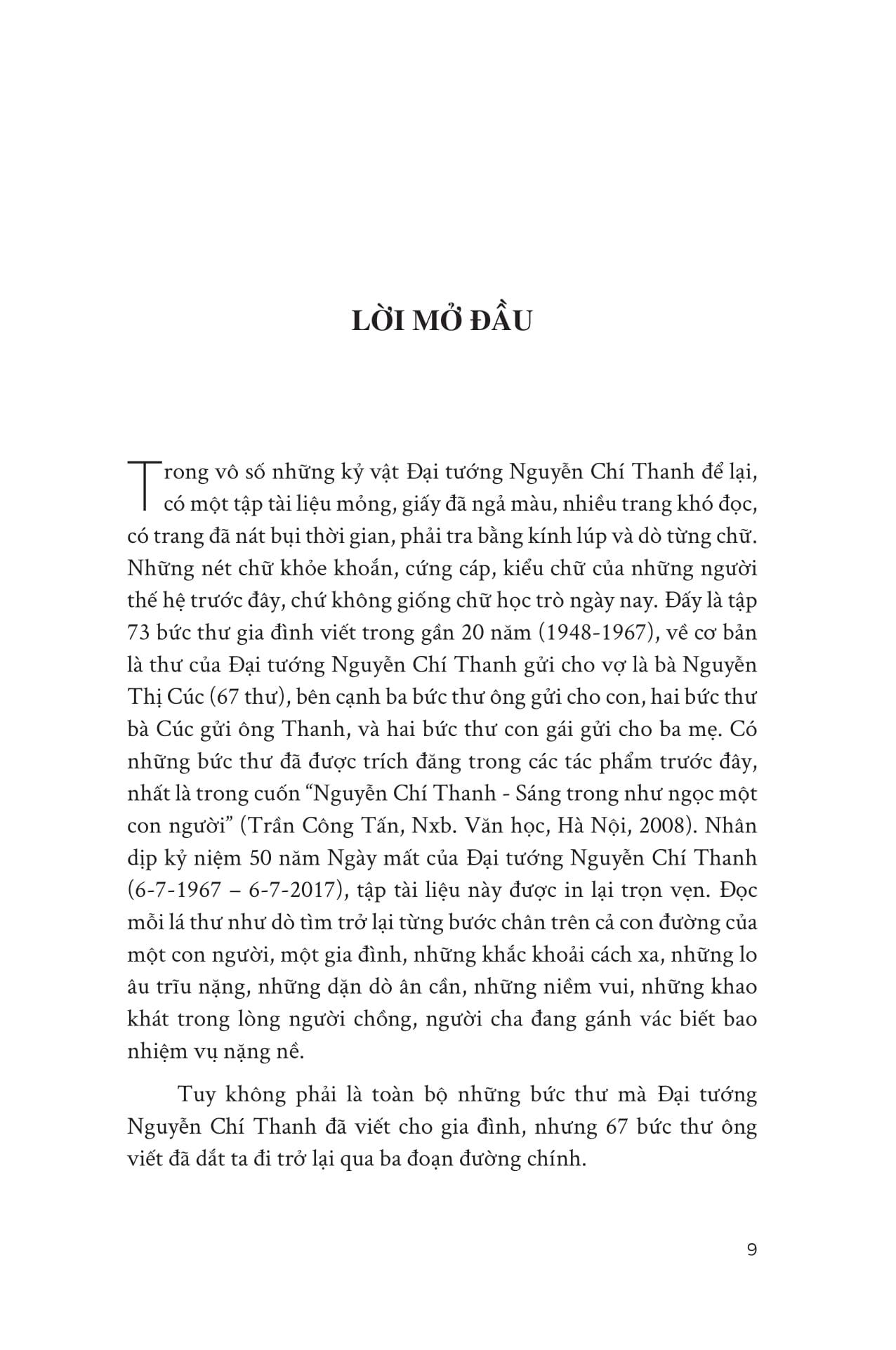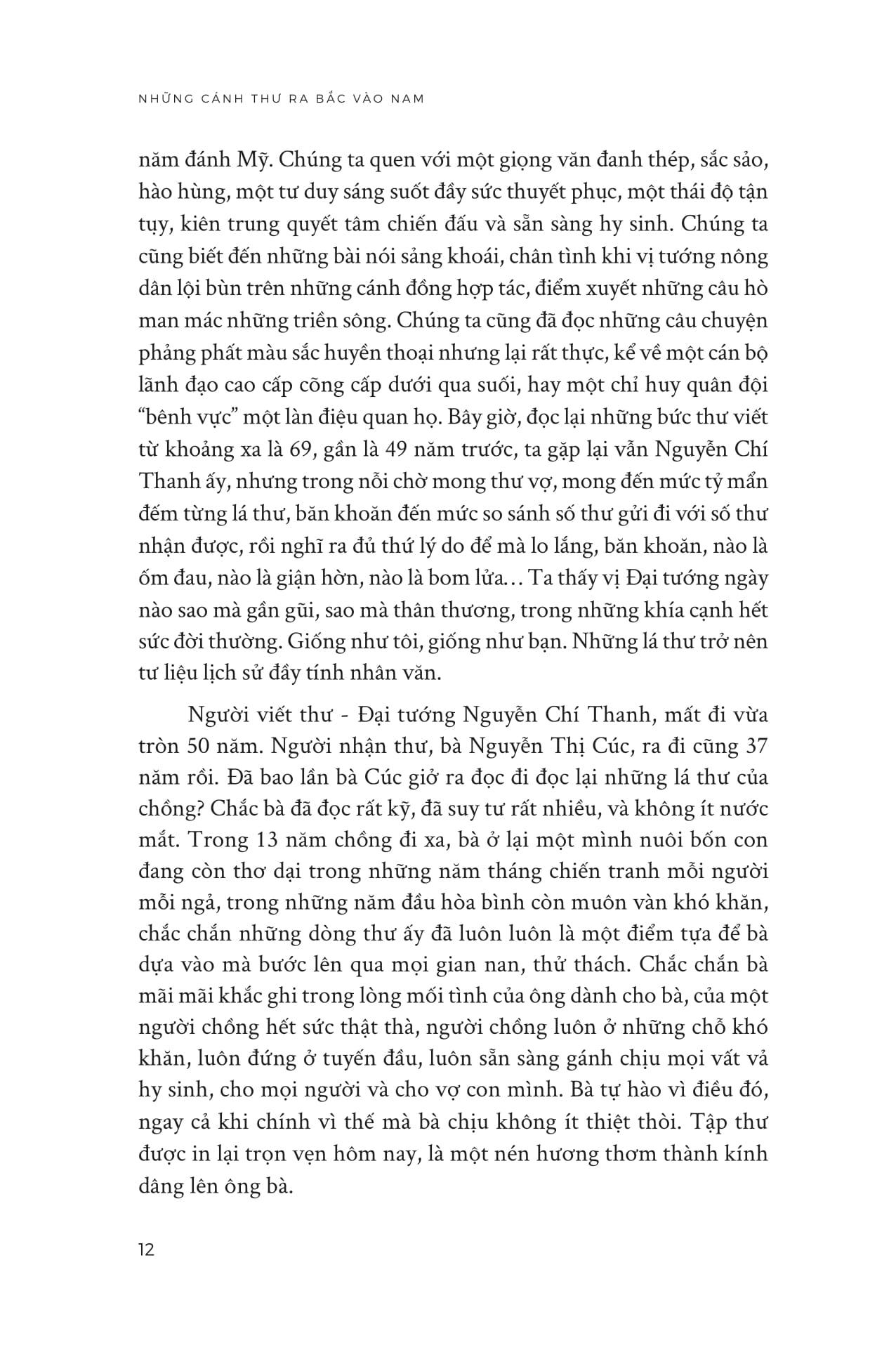 - Những cánh thư ra Bắc vào Nam TRÍCH ĐOẠN/ CÂU QUOTE HAY “Những lá thư này là một di sản Ba Thanh để lại, dành riêng cho con cháu, để họ truyền lại cho mãi mãi những lứa cháu con sau này… như những giọt sữa nuôi dưỡng trong cả cuộc đời, như những dòng máu tiếp tục chảy trong huyết quản” (Trích Lời mở đầu) “Không được thơ Cúc, anh phần thì trông mong, phần thì áy náy, không biết m.ình ăn ở với vợ con thế nào mà đến khi xa nhau phải thế. Em cũng biết tuy nhớ nhau nhiều ngày hay sinh ra nghĩ thế này thế khác, tâm lý ấy cũng có gì là lạ.” (Trích thư Đại tướng Nguyễn Chí Thanh gửi vợ Nguyễn Thị Cúc, ngày 5-7-1950) “Ba dặn các con đây này: Phải gắng học cho giỏi, tính nết cho tốt, làm việc cho khá. Ba chúc các con ngoan để sau này thành người có đạo đức.” (Trích thư Đại tướng Nguyễn Chí Thanh gửi gia đình, tháng 11-1964) “… Đại tướng Nguyễn Chí Thanh vẫn luôn hiện hữu trong cuộc đời chúng ta. Trong các văn kiện, tài liệu của Đảng và Nhà nước. Trong những bộ sách. Trong những cuốn phim. Qua các kỷ vật trong viện bảo tàng. Qua rất nhiều bài viết trên báo chí. Qua truyền hình và đài phát thanh. Với những bức tượng ở quảng trường, trong các khu lưu niệm. Với những miếu thờ giản dị nơi thôn dã...” (Trích Tòng Bạt) “Chúng ta đã đọc những bài báo của Đại tướng với bút danh “Trường Sơn” - những bài viết làm nức lòng dân tộc trong những năm đánh Mỹ. Chúng ta quen với một giọng văn đanh thép, sắc sảo, hào hùng, một tư duy sáng suốt đầy sức thuyết phục, một thái độ tận tụy, kiên trung quyết tâm chiến đấu và sẵn sàng hy sinh. Chúng ta cũng biết đến những bài nói sảng khoái, chân tình khi vị tướng nông dân lội bùn trên những cánh đồng hợp tác, điểm xuyết những câu hò man mác những triền sông. Chúng ta cũng đã đọc những câu chuyện phảng phất màu sắc huyền thoại nhưng lại rất thực, kể về một cán bộ lãnh đạo cao cấp cõng cấp dưới qua suối, hay một chỉ huy quân đội “bênh vực” một làn điệu quan họ. Bây giờ, đọc lại những bức thư viết từ khoảng xa là 69, gần là 49 năm trước, ta gặp lại vẫn Nguyễn Chí Thanh ấy, nhưng trong nỗi chờ mong thư vợ, mong đến mức tỷ mẩn đếm từng lá thư, băn khoăn đến mức so sánh số thư gửi đi với số thư nhận được, rồi nghĩ ra đủ thứ lý do để mà lo lắng, băn khoăn, nào là ốm đau, nào là giận hờn, nào là bom lửa… Ta thấy vị Đại tướng ngày nào sao mà gần gũi, sao mà thân thương, trong những khía cạnh hết sức đời thường. Giống như tôi, giống như bạn. Những lá thư trở nên tư liệu lịch sử đầy tính nhân văn.” … “Đọc mỗi lá thư như dò tìm trở lại từng bước chân trên cả con đường của một con người, một gia đình, những khắc khoải cách xa, những lo âu trĩu nặng, những dặn dò ân cần, những niềm vui, những khao khát trong lòng người chồng, người cha đang gánh vác biết bao nhiệm vụ nặng nề.” (Trích Lời mở đầu)