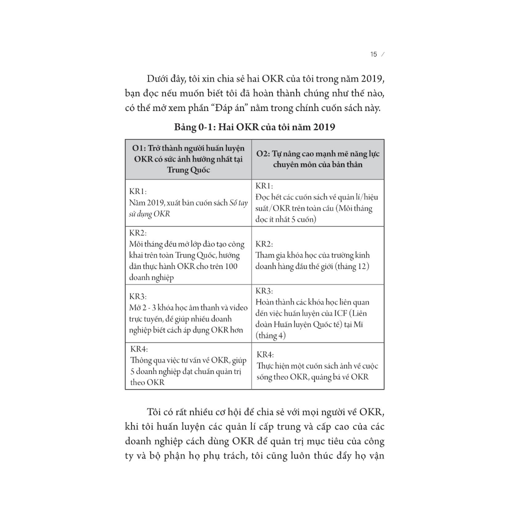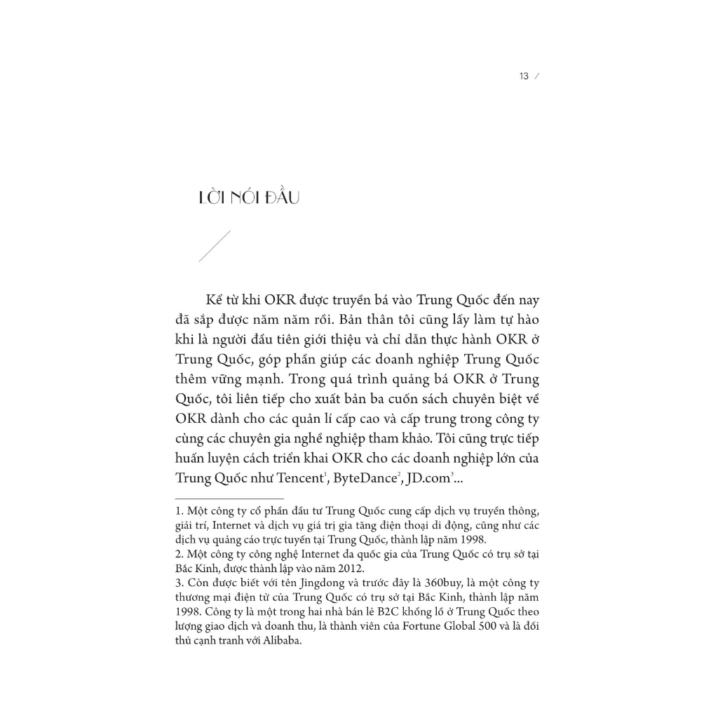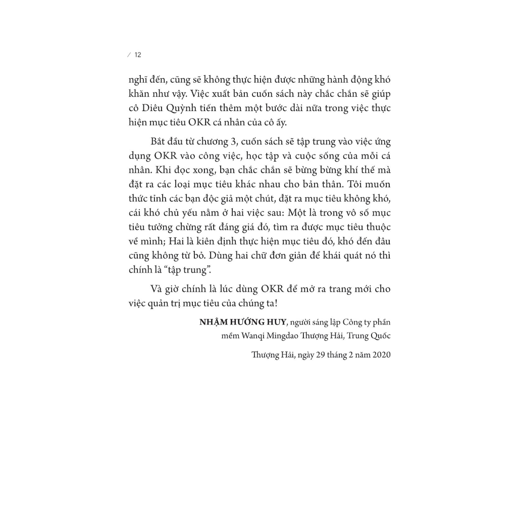 Sự nghiệp của một người rất ngắn ngủi. Sau 40 năm, những gì còn lại chỉ là tạp âm và tiếng vọng. Lúc này, nếu có thể tìm được một mục tiêu đơn thuần, đơn giản, khiến người ta chuyên chú và nó thì đó chắc chắn là một chuyện thật đáng quý. OKR là gì? OKR là viết tắt của cụm từ Tiếng Anh “Objectives and Key Results”, nghĩa là “Mục tiêu và Kết quả then chốt”. Đây là một bộ công cụ quản lí, phương pháp và mô thức tư duy giúp thiết lập mục tiêu và theo dõi quá trình hoàn thành mục tiêu. OKR trở nên phổ biến trong giới doanh nghiệp, đặc biệt các doanh nghiệp lớn của Trung Quốc như Tencent, ByteDance, JD cũng đang triển khai phương thức này. Phóng to động năng của mục tiêu, thu nhỏ tự do của hành động, tập trung vào một hướng duy nhất. Ba câu này đủ để tóm tắc cốt lõi của OKR. Và giờ chính là lúc dùng OKR để mở ra trang mới cho việc quản trị mục tiêu của chúng ta Cuốn sách được tác giả Diêu Quỳnh - Chuyên gia quản lí hiệu suất nhân sự người Trung Quốc, đã chắt lọc những gì tinh túy nhất của phương pháp OKR này, cũng như tìm ra nguyên tắc vận dụng và kết hợp nó với nhu cầu phát triển cá nhân của mỗi người. Bắt đầu từ chương 3, cuốn sách sẽ tập trung vào việc ứng dụng OKR vào công việc, học tập và cuộc sống của mỗi cá nhân. Khi đọc xong, bạn chắc chắn sẽ bừng bừng khí thế mà đặt ra các loại mục tiêu khác nhau cho bản thân. Đặt ra mục tiêu không khó, cái khó chủ yếu nằm ở hai việc sau: Một là trong vô số mục tiêu tưởng chừng rất đáng giá đó, tìm ra được mục tiêu thuộc về mình; Hai là kiên định thực hiện mục tiêu đó, khó đến đâu cũng không từ bỏ. Dùng hai chữ đơn giản để khái quát nó thì chính là “tập trung” .