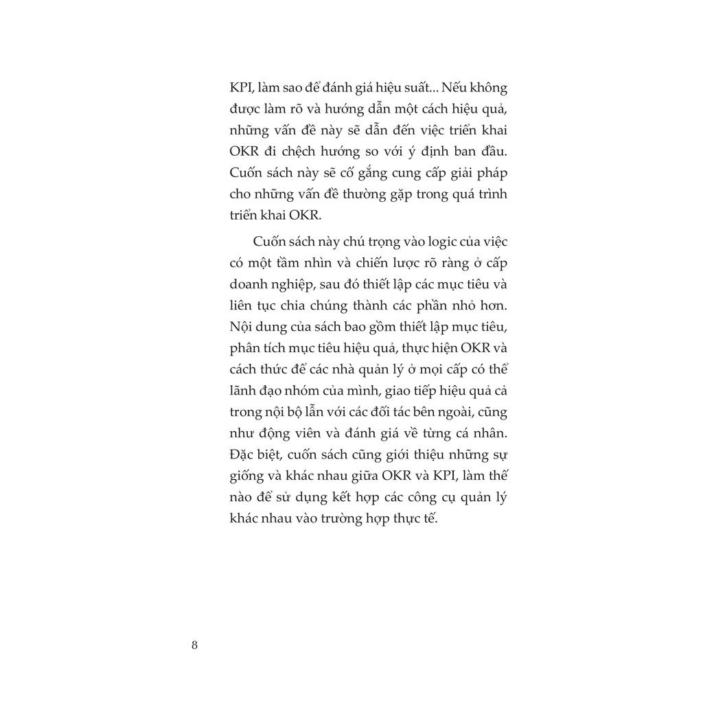 - Nâng cao hiệu suất công việc Cuốn sách cung cấp các khái niệm căn bản nhất về OKR, phù hợp cho những người mới tiếp cận và tìm hiểu về phương pháp quản lý này. Sách gồm 6 chương: Chương 1. Những môi trường nào có thể khiến OKR phát huy được tối đa hiệu quả. Chương 2. Thiết lập và chia nhỏ mục tiêu theo định hướng chiến lược. Chương 3. Tính thách thức của các kết quả chính. Chương 4. Cách dùng OKR để thúc đẩy cá nhân. Chương 5. Xung đột giữa OKR và đánh giá hiệu suất. Chương 6. Sự tồn tại song song của OKR và đánh giá hiệu suất.