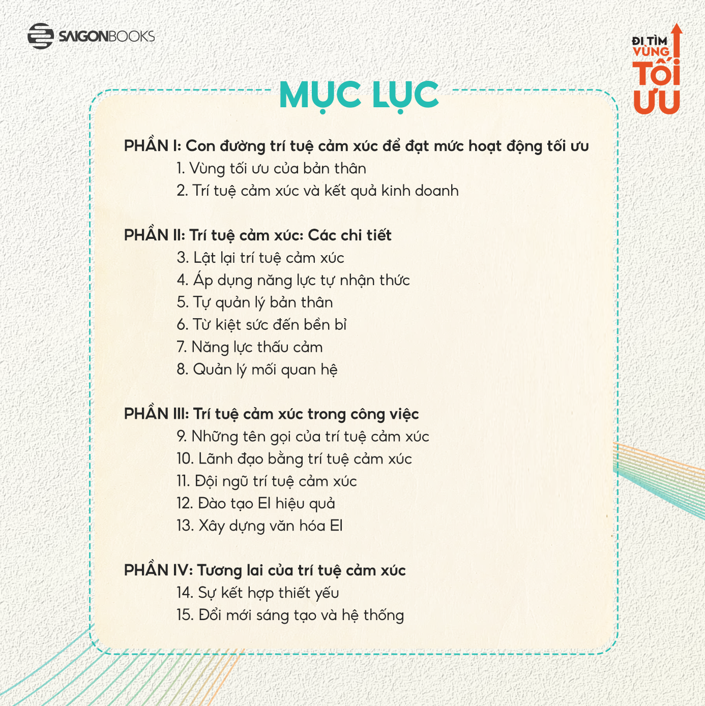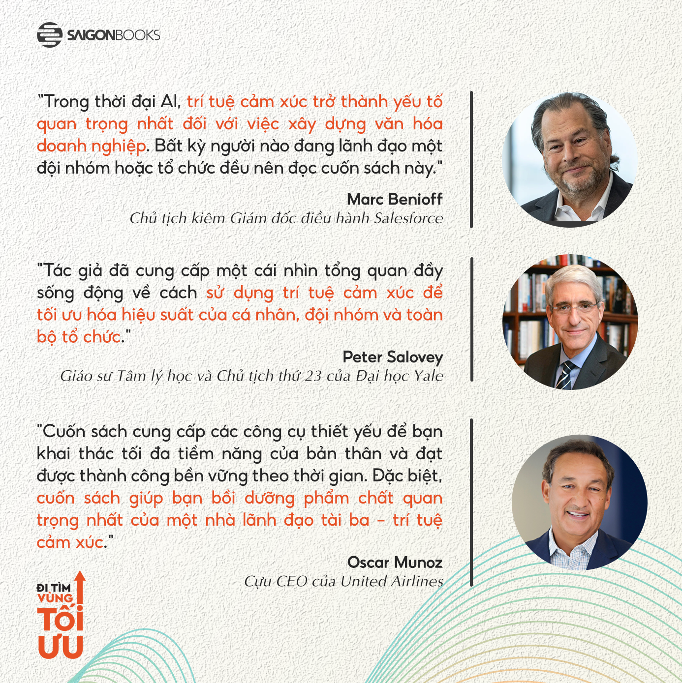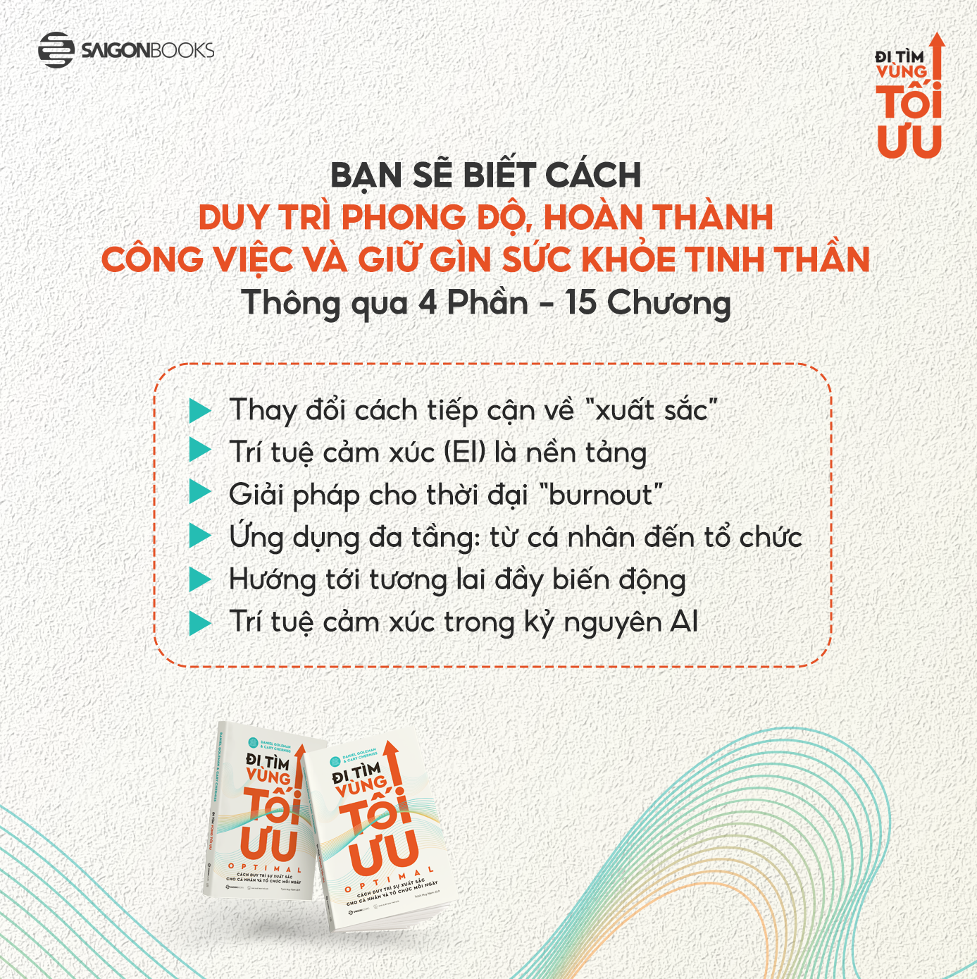 Đi tìm vùng tối ưu - Tác phẩm đem đến một thông điệp quan trọng, rằng thay vì làm việc cật lực để rồi rơi vào mệt mỏi, trí tuệ cảm xúc giúp mỗi cá nhân duy trì phong độ ổn định, vừa hoàn thành công việc, vừa gìn giữ sức khỏe tinh thần. Đây cũng là cuốn sách hiếm hoi cho thấy “một ngày tốt đẹp” có giá trị lâu dài hơn nhiều so với một khoảnh khắc đỉnh cao ngắn ngủi.