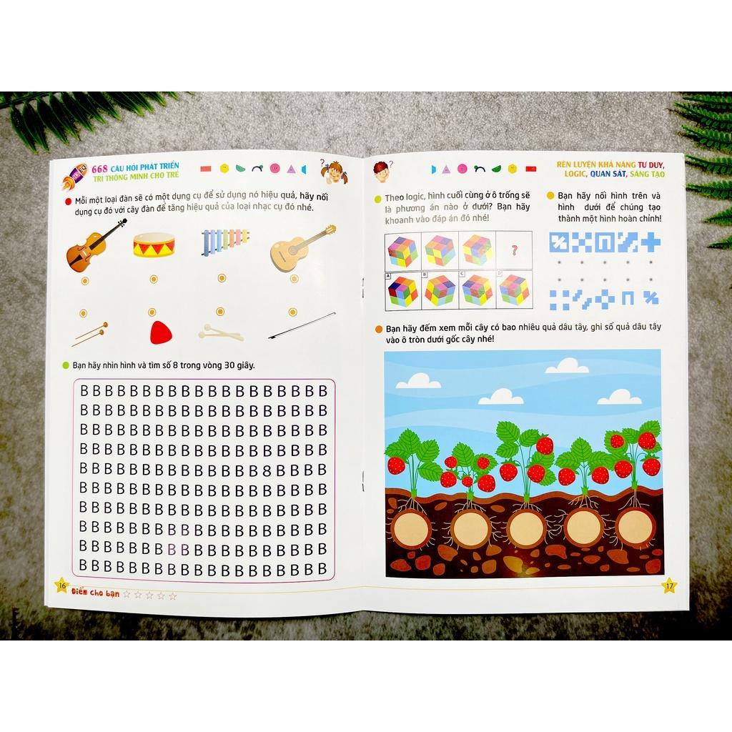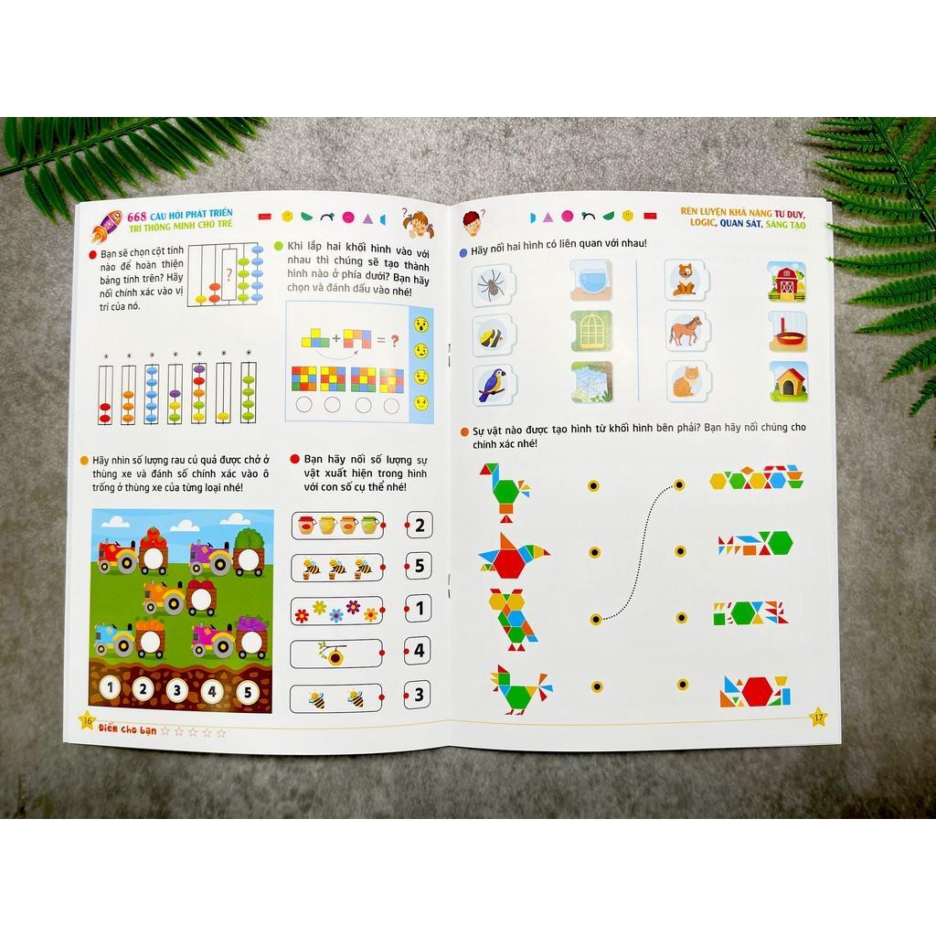 - Bộ Sách 668 Câu hỏi phát triển trí thông minh cho trẻ nhằm phát triển IQ,EQ, Cung cấp những trò chơi toán học logic....giúp trẻ phát huy tối đa khả năng nhận thức , tư duy phân kỳ , tưởng tượ...