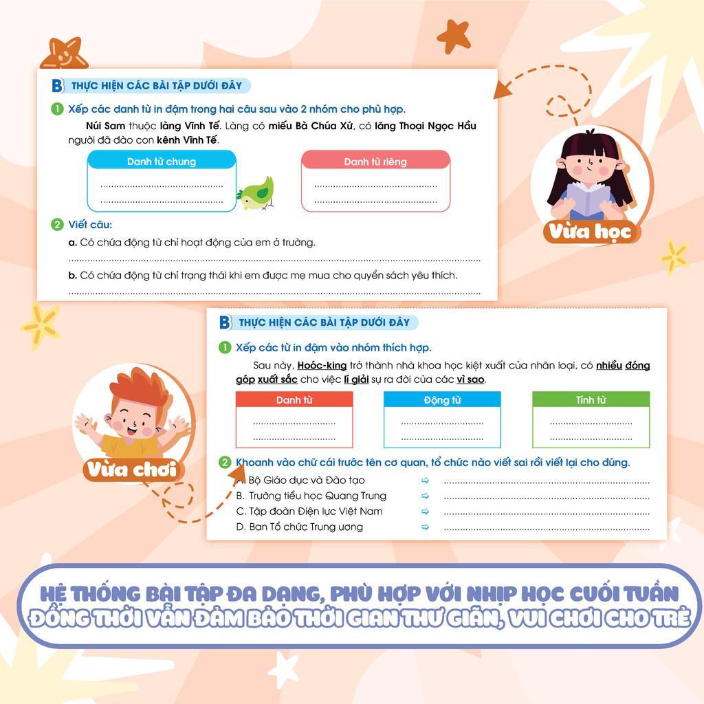 - Hệ thống các bài tập phong phú, mang tính tổng hợp và ôn luyện toàn diện. Hệ thống bài tập đa dạng, lượng phù hợp với việc học cuối tuần để các con vẫn có thời gian thư giãn và vui chơi. Đặc biệt, sau mỗi kì sẽ có bài ôn tập giữa kì và cuối kì giúp con có tài liệu ôn tập cho các kì kiểm tra.