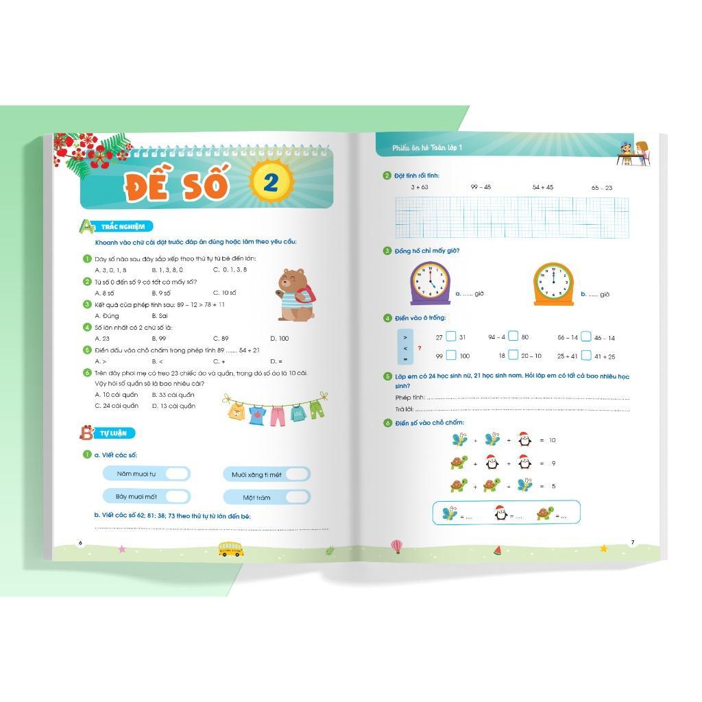 Cuốn sách bao gồm 20 bộ đề, mỗi bộ đề gồm 2 phần trắc nghiệm và tự luận. Điều này giúp các em thực hành và nắm vững kiến thức thông qua các dạng bài tập khác nhau. Sự đa dạng này cũng giúp rèn luyện khả năng tư duy, suy luận và kích thích trí tưởng tượng của các em nhỏ.