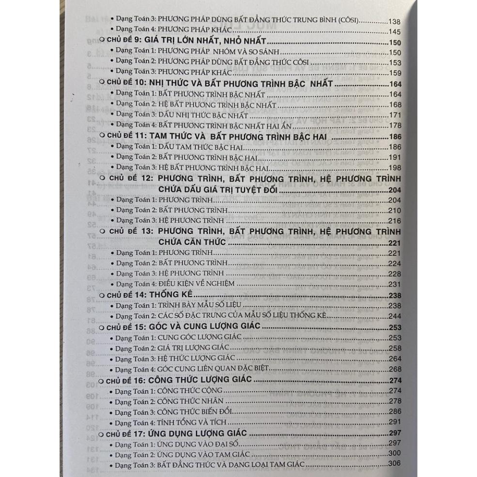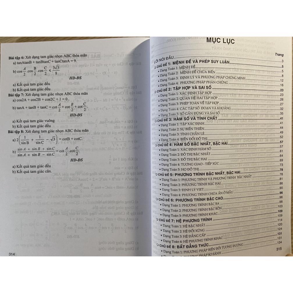 Nội dung gồm có Chủ đề 1: Mênh đề và phép suy luận Chủ đề 2: Tập hợp và sai số Chủ đề 3: Hàm số và tính chất Chủ đề 4: Hàm số bậc , bậc hai Chủ đề 5: Phương trình , bậc hai Chủ đề 6: Phương trình bậc cao Chủ đề 7: Hệ phương trình Chủ đề 8: Bất đẳng thức Chủ đề 9: Giá trị lớn , nhỏ nhất Chủ đề 10: Nhị thức và bất phương trình Chủ đề 11: Tam thức và bất phương trình bậc hai Chủ đề 12: Phương trình, bất phương trình, hệ phương trình chứa dấu giá trị tuyệt đối Chủ đề 13: Phương trình, bất phương trình, hệ phương trình chứa căn thức Chủ đề 14: Thống kê Chủ đề 15: Góc và cung lượng giác Chủ đề 16: Công thức lượng giác Chủ đề 17: Ứng dụng lượng giác