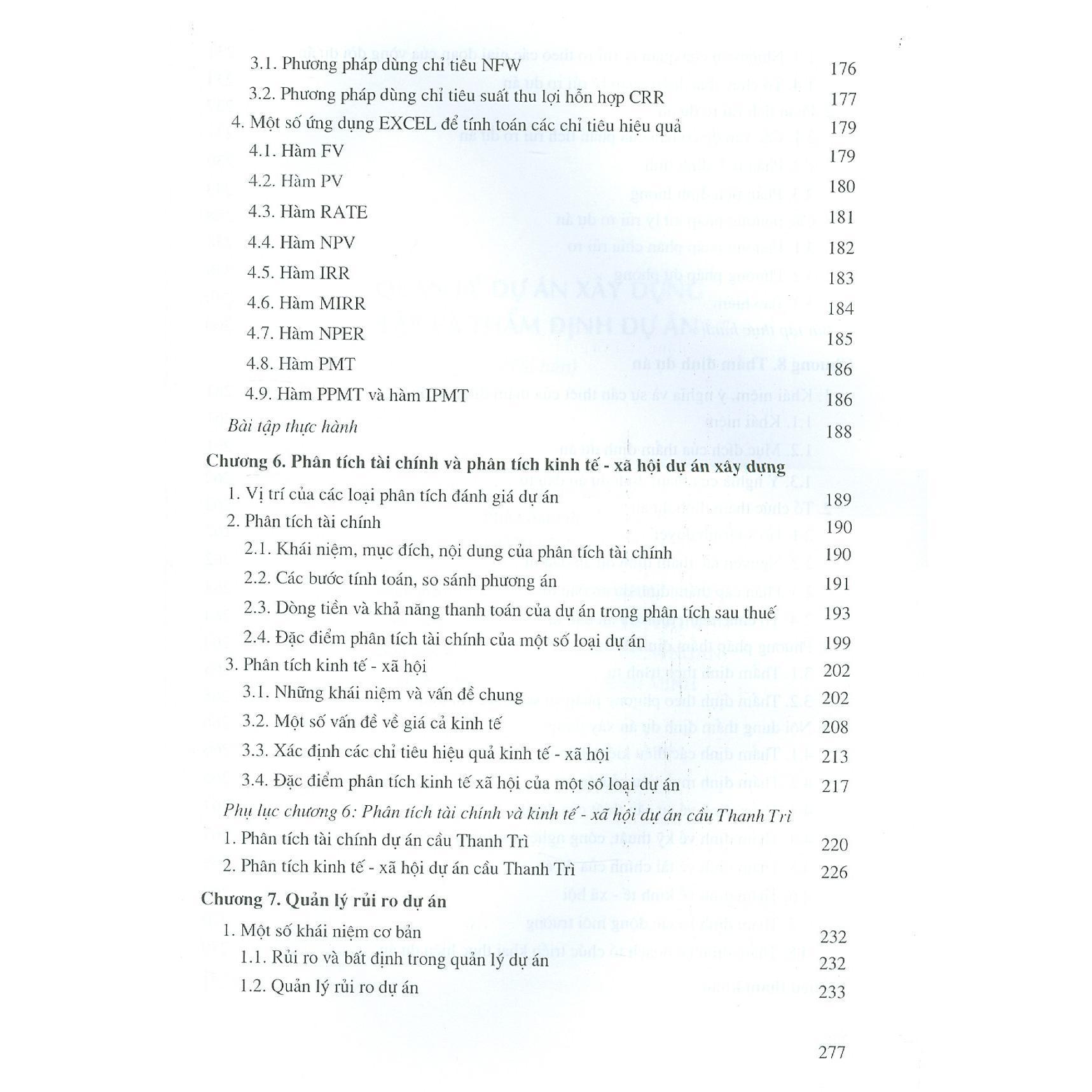 - Quyển 3: Quản lý dự án xây dựng - Giai đoạn thi công xây dựng công trình. Tài liệu này là quyển "Quản lý dự án xây dựng - Lập và thẩm định dự án" và đi sâu nghiên cứu các vấn đề từ khi dự án còn trong ý tưởng đầu tư đến khi được phê duyệt, có quyết định đầu tư. Trong quyển này, ngoài các ví dụ cụ thể, còn giới thiệu các nội dung chính của dự án đầu tư xây dựng cầu Thanh trì và các thực hành cụ thể gắn với dự án đó. Bộ tài liệu về quản lý dự án xây dựng có thể dùng để tham khảo hữu ích không chỉ cho các sinh viên, học viên các chuyên ngành kinh tế và quản lý xây dựng mà còn hữu ích cho các cán bộ quản lý kinh tế - kỹ thuật đang làm việc trong ngành xây dựng. Mục Lục TRANG Lời nói đầu 3 Danh mục ký hiệu và các từ viết tắt 5 Chương 1. Dự án đầu tư xây dựng công trình