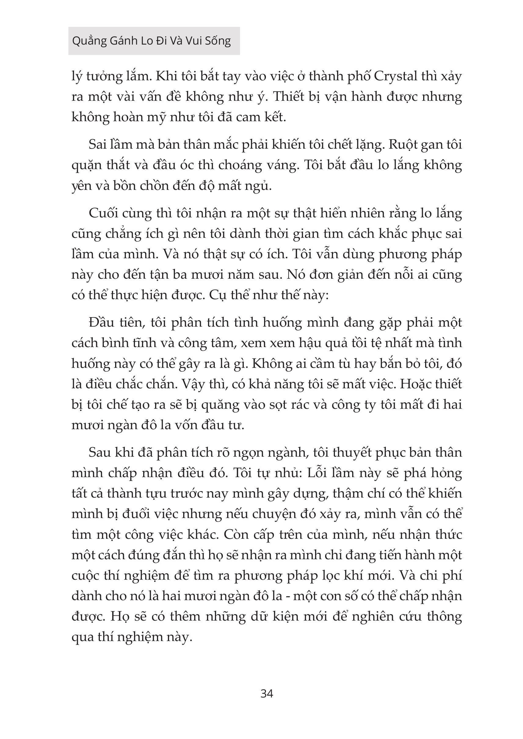 - Số trang: 260 GIỚI THIỆU SÁCH Sau Đắc Nhân Tâm thì Quẳng gánh lo đi và vi sống (How to Stop Worrying and start living) là một trong những cuốn sách bán chạy nhất trên thế giới. Bất kỳ ai đang sống đều sẽ có những lo lắng thường trực về học hành, công việc, những hoá đơn, chuyện nhà cửa,... Cuộc sống không dễ dàng giải thoát bạn khỏi căng thẳng, ngược lại, nếu quá lo lắng, bạn có thể mắc bệnh trầm cảm. Quẳng Gánh Lo Đi Và Vui Sống khuyên bạn hãy khóa chặt dĩ vãng và tương lai lại để sống trong cái phòng kín mít của ngày hôm nay. Mọi vấn đề đều có thể được giải quyết, chỉ cần bạn bình tĩnh và xác định đúng hành động cần làm vào đúng thời điểm. Cuốn sách được viết ra bởi người tự nhận mình là "một trong những kẻ bất hạnh nhất New York " nhưng chỉ sau một thời gian ngắn bằng những nỗ lực vượt bậc của mình, ông đã trở thành 1 người xuất trúng được hàng triệu người biết đến. Cuốn sách là tập hợp các quy tắc giúp bạn giải quyết những cảm xúc tiêu cực, lo lắng và buồn bã. Không chỉ đưa được người đọc đến một cuộc sống thú vị và trọn vẹn hơn mà còn giúp chúng ta nhận thức rõ về bản thân và cả những người xung quanh SƠ LƯỢC VỀ NỘI DUNG Cuốn sách bao gồm 10 phần khác nhau, với rất nhiều những kinh nghiệm và các lời khuyên từ tác giả cũng như những người đi trước, giúp bạn có thể nhận thức được những điều đúng đắn nhất. Chi tiết