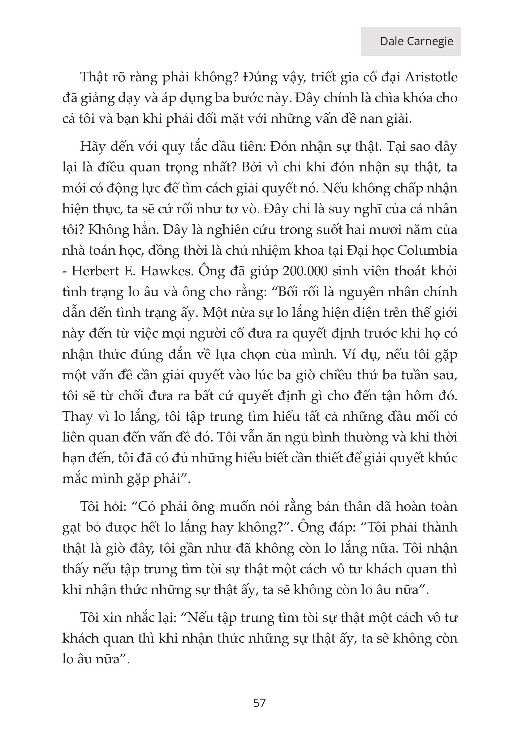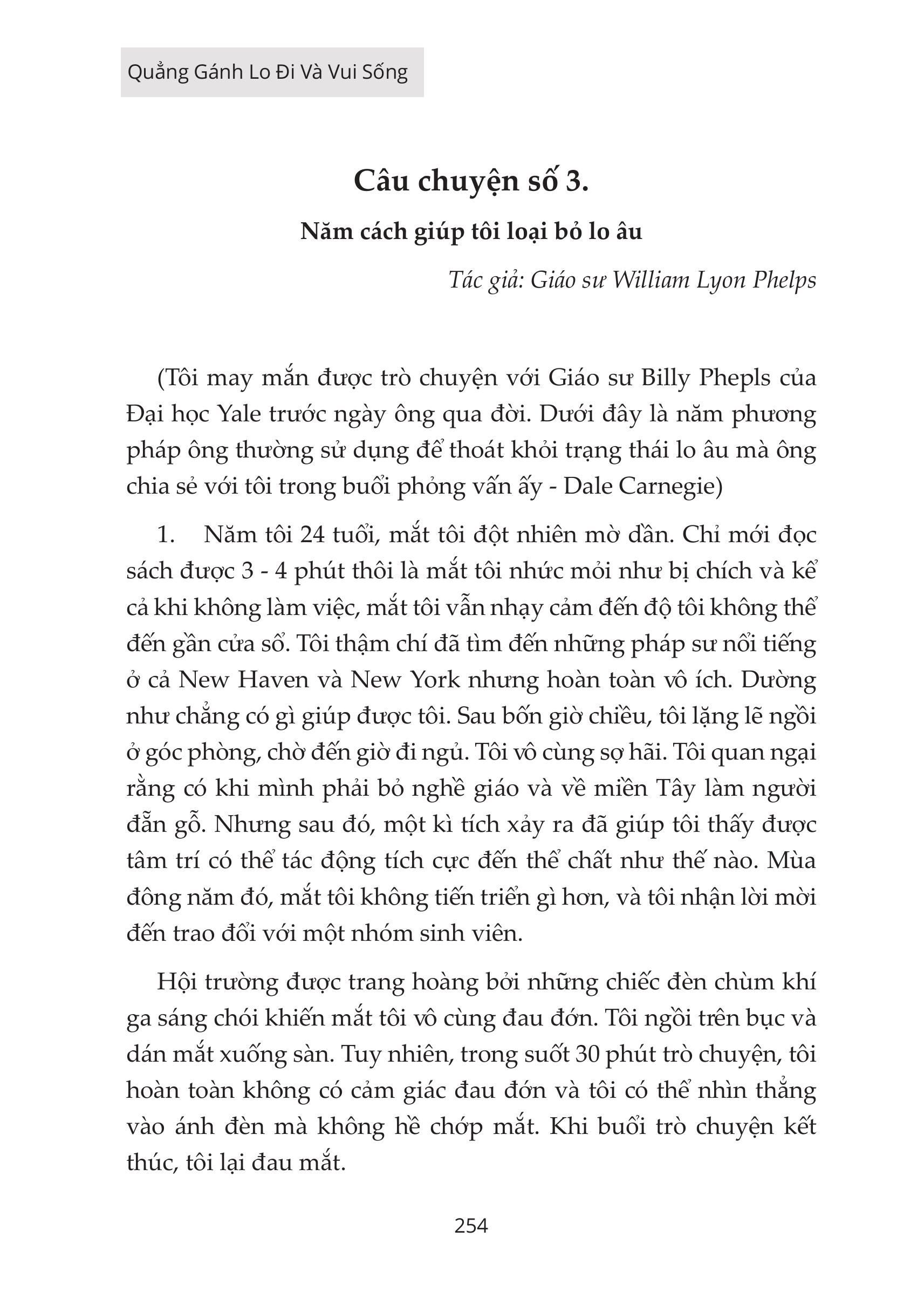 - Số trang: 260 GIỚI THIỆU SÁCH Sau Đắc Nhân Tâm thì Quẳng gánh lo đi và vi sống (How to Stop Worrying and start living) là một trong những cuốn sách bán chạy nhất trên thế giới. Bất kỳ ai đang sống đều sẽ có những lo lắng thường trực về học hành, công việc, những hoá đơn, chuyện nhà cửa,... Cuộc sống không dễ dàng giải thoát bạn khỏi căng thẳng, ngược lại, nếu quá lo lắng, bạn có thể mắc bệnh trầm cảm. Quẳng Gánh Lo Đi Và Vui Sống khuyên bạn hãy khóa chặt dĩ vãng và tương lai lại để sống trong cái phòng kín mít của ngày hôm nay. Mọi vấn đề đều có thể được giải quyết, chỉ cần bạn bình tĩnh và xác định đúng hành động cần làm vào đúng thời điểm. Cuốn sách được viết ra bởi người tự nhận mình là "một trong những kẻ bất hạnh nhất New York " nhưng chỉ sau một thời gian ngắn bằng những nỗ lực vượt bậc của mình, ông đã trở thành 1 người xuất trúng được hàng triệu người biết đến. Cuốn sách là tập hợp các quy tắc giúp bạn giải quyết những cảm xúc tiêu cực, lo lắng và buồn bã. Không chỉ đưa được người đọc đến một cuộc sống thú vị và trọn vẹn hơn mà còn giúp chúng ta nhận thức rõ về bản thân và cả những người xung quanh SƠ LƯỢC VỀ NỘI DUNG Cuốn sách bao gồm 10 phần khác nhau, với rất nhiều những kinh nghiệm và các lời khuyên từ tác giả cũng như những người đi trước, giúp bạn có thể nhận thức được những điều đúng đắn nhất. Chi tiết