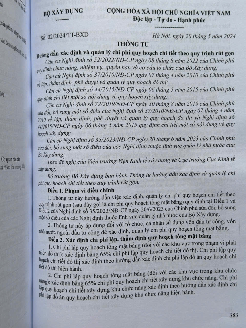 – Thông tư số 02/2024/TT-BXD ngày 20 tháng 5 năm 2024 của Bộ Xây dựng hướng dẫn xác định và quản lý chi phí quy hoạch chi tiết theo quy trình rút gọn…