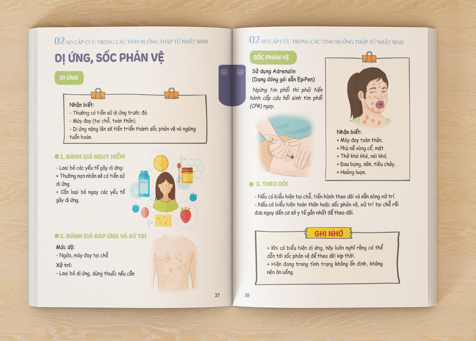 LỢI ÍCH KHI SỬ DỤNG CUỐN SÁCH: - Giữ an toàn cá nhân và người khác, kiến thức về sơ cứu giúp bạn tự bảo vệ mình khi đối mặt với tình huống khẩn cấp. Giúp đỡ người gặp nạn, giảm nguy cơ tổn thương nặng hơn và tăng cơ hội phục hồi. - Hỗ trợ ngăn chặn tổn thương nặng hơn Biết cách xử trí sơ cứu đúng cách có thể ngăn chặn sự lây lan của vết thương, giảm nguy cơ tổn thương trở nên nặng nề và tăng khả năng sống sót cho người bị thương. - Phản ứng nhanh trong tình huống khẩn cấp Kiến thức về sơ cứu giúp bạn phản ứng nhanh chóng và hiệu quả khi đối mặt với các tình huống khẩn cấp y tế. Giảm thời gian chờ đợi cho sự giúp đỡ chuyên nghiệp, giúp tăng cơ hội cứu sống -Tăng cường sự tự tin, bình tĩnh hơn trong mọi tình huống Giúp bạn tự tin hơn, biết cách bảo vệ an toàn cho bản thân và giúp đỡ những người xung quanh. Trong gia đình luôn cần thiết những kiến thức về sơ cứu, chính là cách:"Sống an toàn và khỏe mạnh".