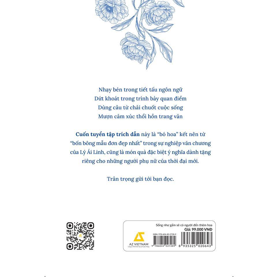 Với mong muốn lan tỏa những giá trị tinh thần của Lý Ái Linh tới đông đảo độc giả, SỐNG NHƯ GẤM SẼ CÓ NGƯỜI ĐẾN THÊM HOA là cuốn tuyển tập trích dẫn được biên soạn dựa trên bộ tứ tác phẩm hay nhất của cô, hy vọng trở thành món quà ý đẹp lời hay dành tặng cho tất cả những người phụ nữ của thời đại mới.