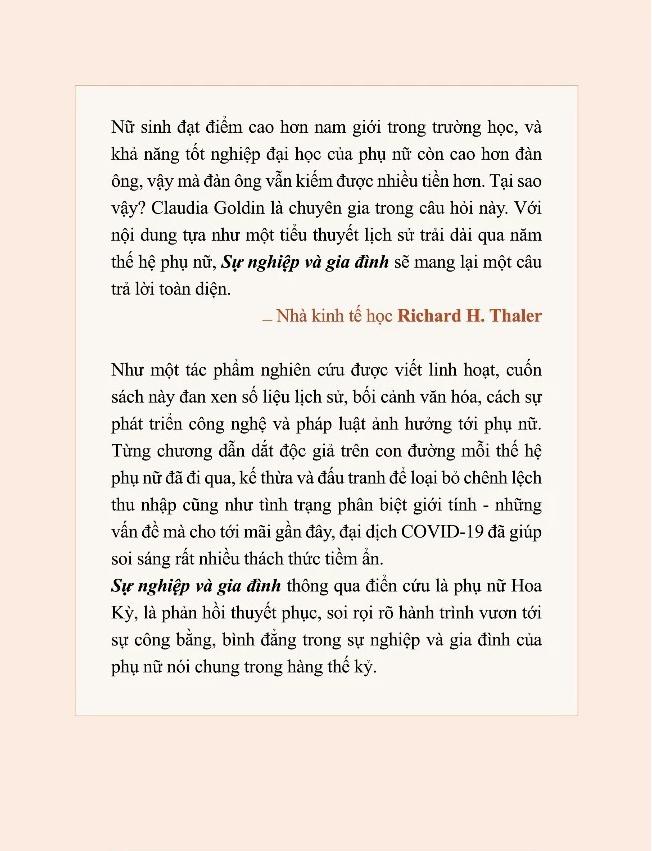 Như một tác phẩm nghiên cứu được viết linh hoạt, cuốn sách này đan xen số liệu lịch sử, bối cảnh văn hóa, cách sự phát triển công nghệ và pháp luật ảnh hưởng tới phụ nữ. Từng chương dẫn dắt độc giả trên con đường mỗi thế hệ phụ nữ đã đi qua, kế thừa và đấu tranh để loại bỏ chênh lệch thu nhập cũng như tình trạng phân biệt giới tính - những vấn đề mà cho tới mãi gần đây, đại dịch COVID-19 đã giúp soi sáng rất nhiều thách thức tiềm ẩn. Sự nghiệp và gia đình thông qua điển cứu là phụ nữ Hoa Kỳ, là phản hồi thuyết phục, soi rọi hành trình vươn tới sự công bằng, bình đẳng trong sự nghiệp và gia đình của phụ nữ nói chung trong hàng thế kỷ.