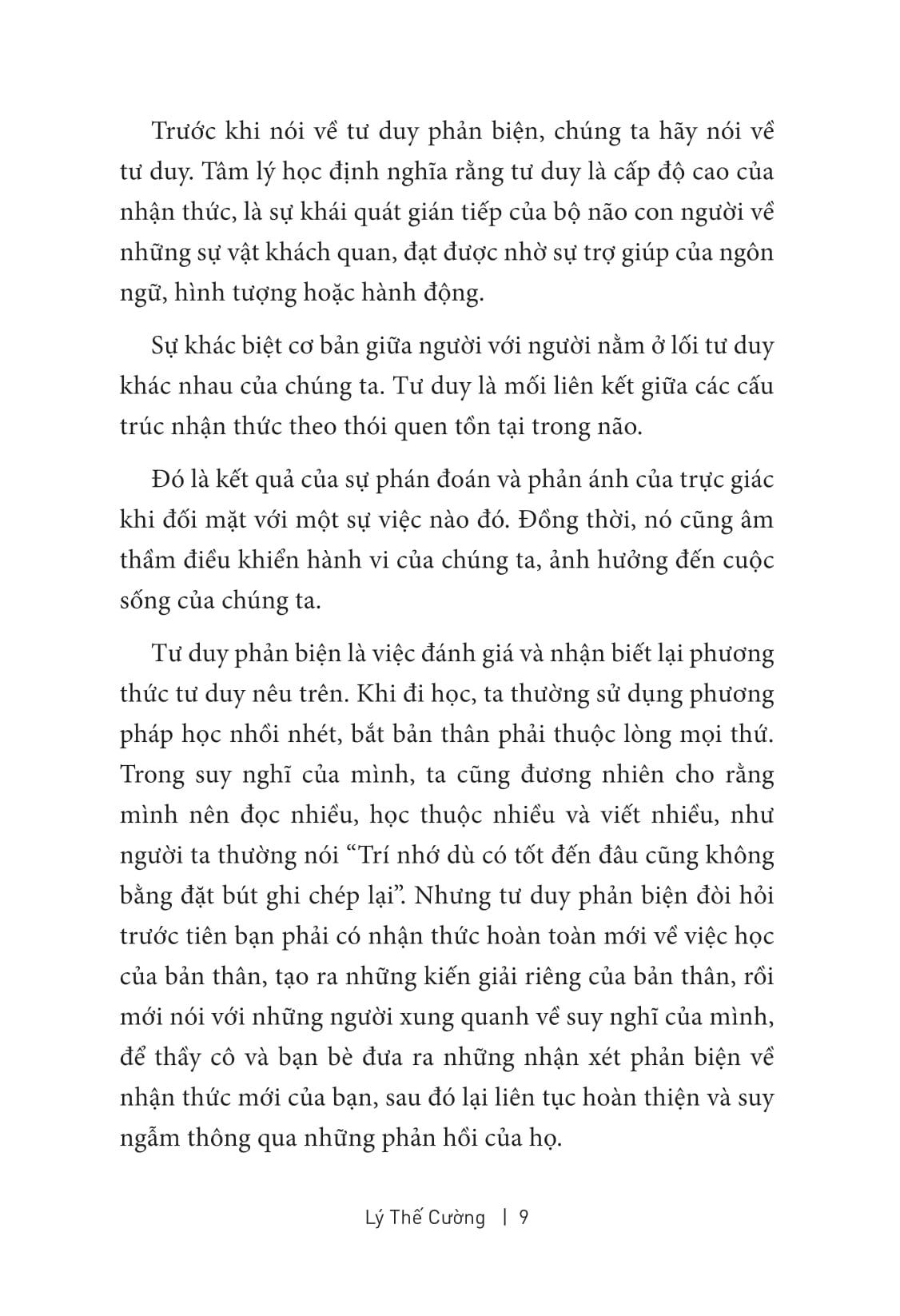 Trong cuốn sách Sức mạnh của tư duy phản biện, tác giả Lý Thế Cường sẽ cho bạn thấy, việc rèn luyện tư duy phản biện thực chất không hề khó, nó tồn tại trong vô vàn tương tác từ nhỏ đến lớn của cuộc sống. Nếu được vận dụng có chủ đích, đây sẽ là công cụ đắc lực giúp bạn tạo ra đột phá trong thế giới quan của bản thân, giải quyết các vấn đề khó khăn và đưa ra các quyết định thông minh hơn.