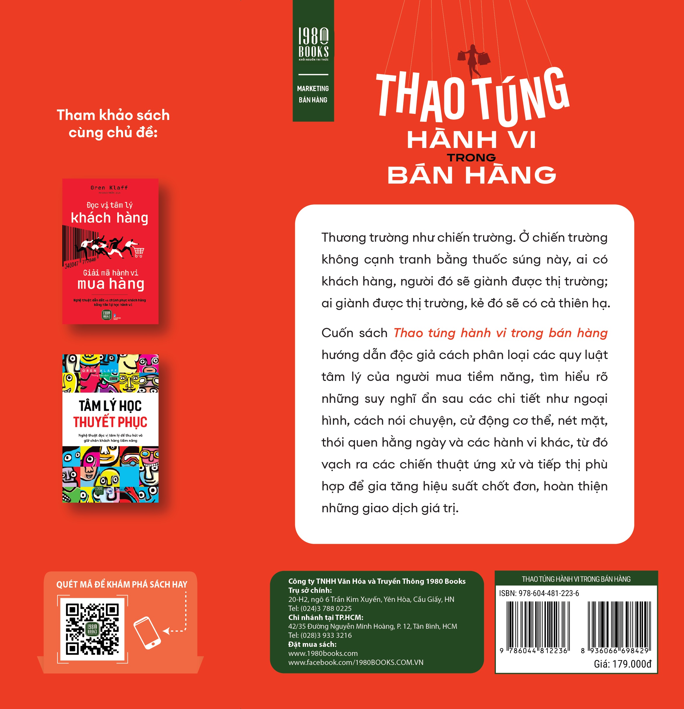 Thuyết phục mỗi khách hàng “chốt đơn” giống như một bài toán nan giải đối với nhiều nhân viên bán hàng. Qua cuốn sách Thao túng hành vi trong bán hàng, chúng ta sẽ biết được cách phân loại các quy luật tâm lý của người mua tiềm năng, tìm hiểu rõ những suy nghĩ ẩn sau các hành vi của khách, từ đó vạch ra các chiến thuật ứng xử và tiếp thị phù hợp, thành công hoàn thiện giao dịch. Cuốn sách cung cấp nội dung toàn diện, chi tiết, đồng thời sử dụng nhiều ví dụ thiết thực để minh họa cho các tình huống thương lượng thường gặp trong thực tiễn bán hàng. Đây được coi là "bí quyết võ công" để doanh nghiệp có thể hiểu hơn về khách hàng của mình và khéo léo truyền thông đến khách hàng một cách chân tình nhất.