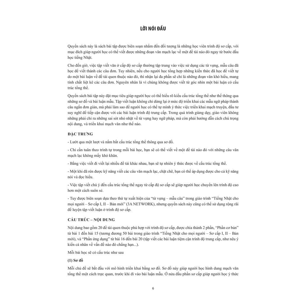 Giới thiệu chung về sách: Sách nằm trong bộ Minna no Nihongo - Tiếng Nhật dành cho mọi người - Bản mới. Là sách bổ trợ giúp người học nâng cao kỹ năng viết, trình bày suy nghĩ của bản thân về nhiều chủ đề khác nhau. Người học bắt đầu với việc luyện tập nắm bắt cấu trúc tổng thể và lên sơ đồ mạch văn. Với việc viết đi viết lại nhiều đề tài khác nhau, người học sẽ tự nhiên ý thức được về cấu trúc tổng thể, từ đó có thể áp dụng được cho cả kỹ năng nói và đọc hiểu.