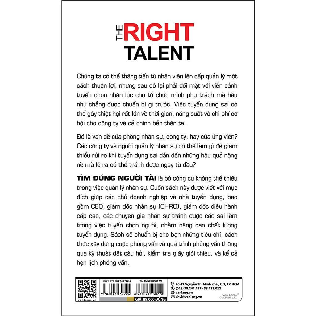 Chúng ta có thể thăng tiến từ nhân viên lên cấp quản lý một cách thuận lợi, nhưng sau đó lại phải đối mặt với viễn cảnh tuyển chọn nhân lực cho tổ chức mình phụ trách mà hầu như chẳng được chuẩn bị gì trước. Việc tuyển dụng sai có thể gây thiệt hại rất lớn về thời gian, năng suất và chi phí cơ hội cho công ty và cả chính bản thân ta. Đó là vấn đề của phòng nhân sự, công ty, hay của ứng viên? Các công ty và người quản lý nhân sự có thể làm gì để giảm thiểu rủi ro khi tuyển dụng sai dẫn đến những hậu quả nặng nề mà lẽ ra có thể tránh được ngay từ đầu? TÌM ĐÚNG NGƯỜI TÀI là bộ công cụ không thể thiếu trong việc quản lý nhân sự. Cuốn sách này được viết với mục đích giúp các chủ doanh nghiệp và nhà tuyển dụng, bao gồm CEO, giám đốc nhân sự (CHRO), giám đốc điều hành cấp cao, các chuyên gia nhân sự tránh được các sai lầm trong việc tuyển chọn người, nhằm nâng cao chất lượng tuyển dụng. Sách sẽ chuẩn bị cho bạn những tiêu chí, cách thức xây dựng cuộc phỏng vấn và quá trình phỏng vấn thông qua kỹ thuật đặt câu hỏi, kiểm tra giấy giới thiệu, và kể cả hẹn lịch phỏng vấn.