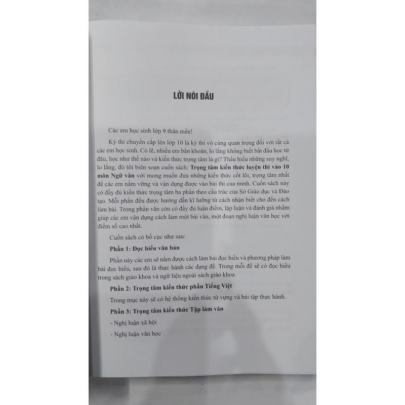 Nôi dung gồm có - Đọc hiểu văn bản: Có đầy đủ phương pháp nhận biết và cách làm bài giúp học sinh đạt điểm tối đa trong kì thi - Nghị luận xã hội: Đây là phần chiếm nội dung quan trọng và điểm số cao trong cấu trúc bài thi. Ở phần này có cấu trúc và cách làm một cách khoa học giúp cho mọi học sinh từ trung bình cũng làm được bài một cách dễ dàng. - Nghị luận Văn học: Nghị luận văn học là phần mà khó nhằn đối với nhiều học sinh nhưng đến với cuốn sách trọng tâm kiến thức luyện thi vào 10 môn Ngữ Văn sẽ giúp các em xóa bỏ nỗi sợ khi làm văn.
