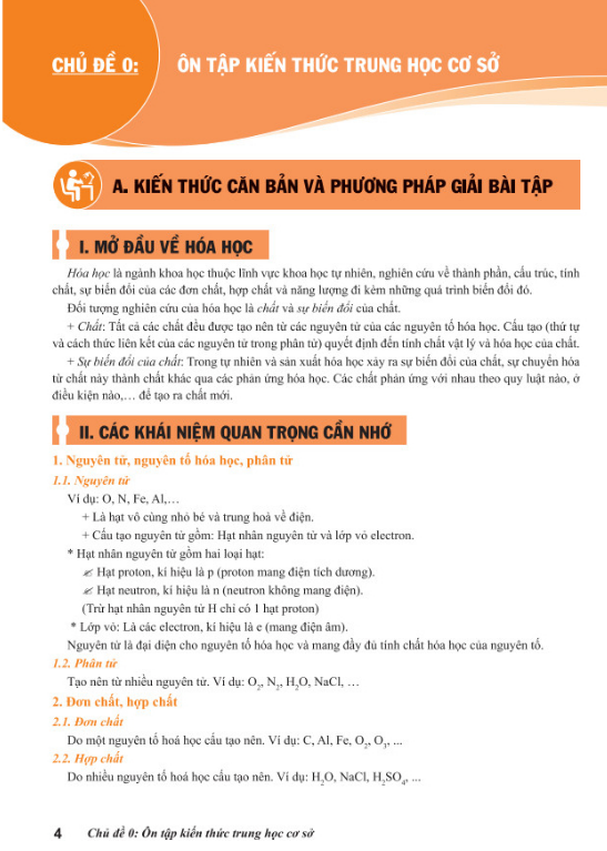 Phần 1: Tóm tắt có mở rộng và nâng cao kiến thức quan trọng của bài học theo từng chủ đề của SGK, có phân dạng và giải chi tiết bài tập tự luận và có bài tập trắc nghiệm đối với từng dạng để học sinh luyện tập. Đặc biệt với cuốn lớp 10 các tác giả đưa vào chủ đề 0: "Ôn tập kiến thức trung học cơ sở" nhằm giúp các em học sinh ôn tập lý thuyết trọng tâm, công thức tính và các dạng bài toán Hóa học cơ bản ở THCS để từ đó các em có sự tự tin khi học các chuyên đề của SGK Hóa học 10 mới