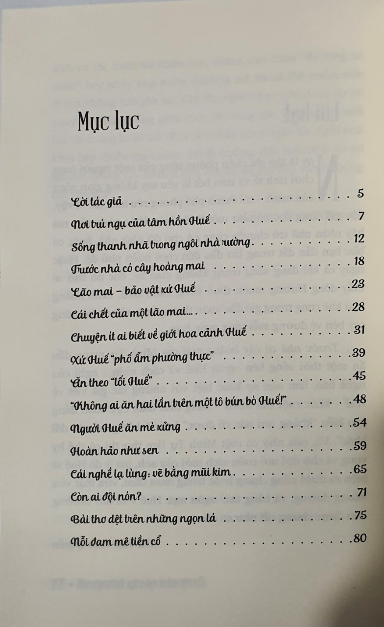 nhà xuất bản : phụ nữ tác giả: Minh Tự năm : 2024 trang : 221 nhà phát hành : nhà xuất bản phụ nữ NỘI DUNG cuốn sách này xin cùng khám phá cuộc sống và con người huế , dù không thể nói hết cuộc sống muôn màu muôn vẻ của lối huế , nó chỉ là trạng thái của huế được chúng tôi đọc và thuật lai bằng cách viết của một người báo vì tình yêu huế , chúng ta hảy cùng nhau viết tiếp về vùng đất và con người việt nam mang nhiều màu sắc nghệ thuật , để cùng du khách chúng ta tìm đến đây , trải nghiệm lối sống đầy hương hoa, dân dã mà vẫn sang trọng , tao nhã và bình dị
