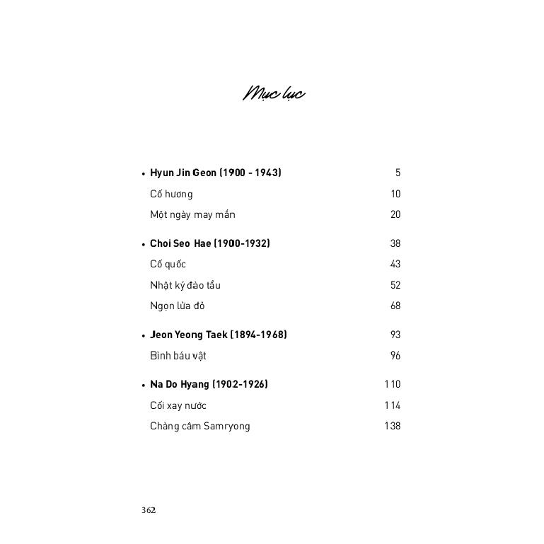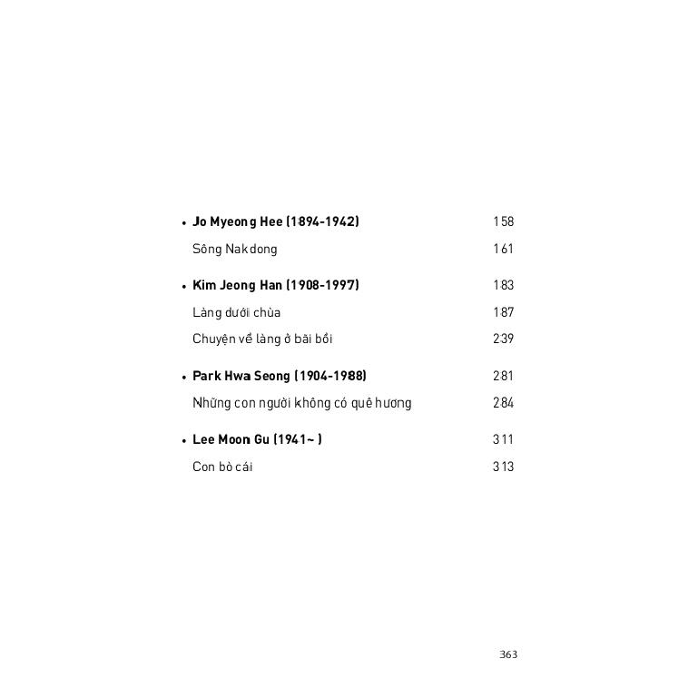 Tác phẩm giới thiệu một số nhà văn nổi bậc nhất ở Hàn Quốc, bao gồm Hyun Jin Geon, Choi Seo Hae, Jeon Yeong Taek, Na Do Hyang, Jo Myeong Hee, Kim Jeong Han, Park Hwa Seong, cũng như cây bút xuất sắc đương đại Lee Moon Gu.