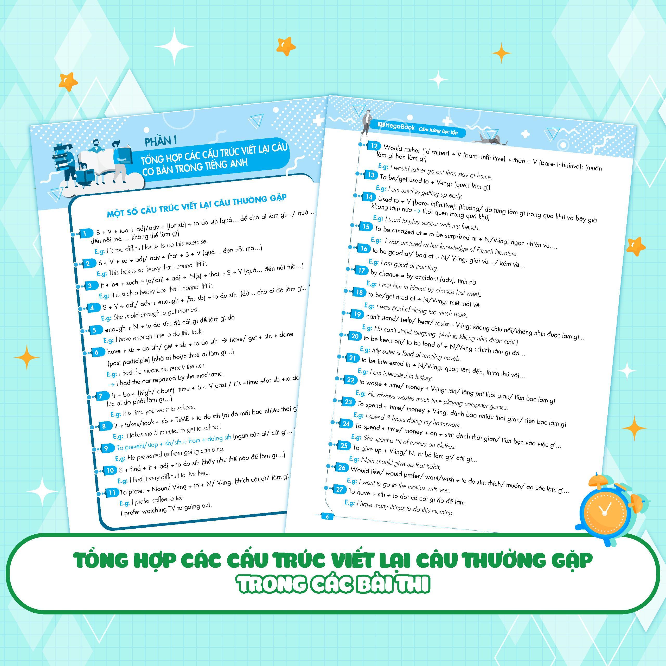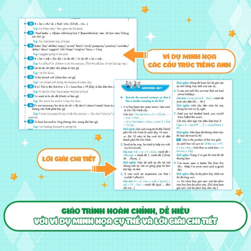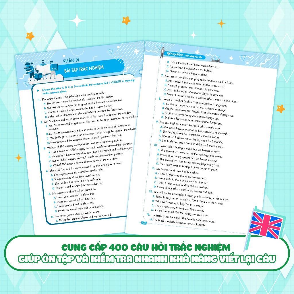 Là cuốn sách Viết lại câu Duy Nhất trên thị trường có lời giải Siêu chi tiết. Đáp án mỗi câu hỏi đều được trình bày theo cấu trúc: Câu Viết lại hoàn chỉnh - Cấu trúc ngữ pháp được sử dụng trong bài - Dịch nghĩa