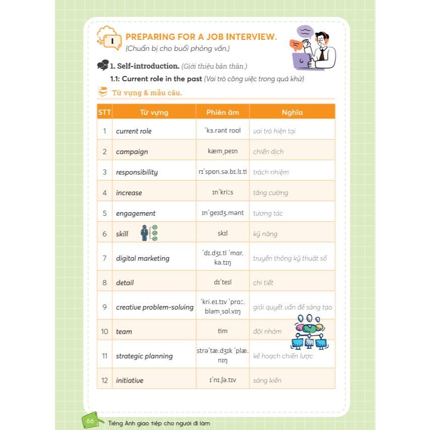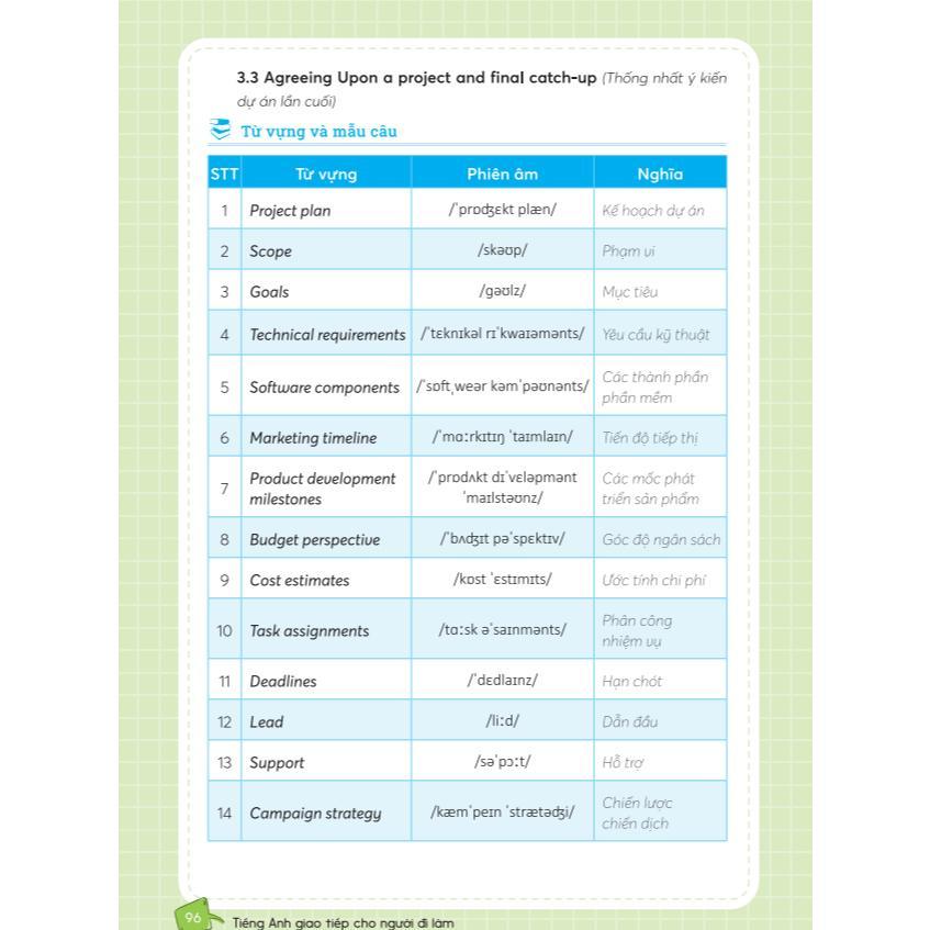 - Nội dung cuốn sách Tự Học Tiếng Anh Giao Tiếp Cho Người Đi Làm Nội dung cuốn sách được chia thành 5 phần chính, mỗi phần đều bám sát nhu cầu thực tế của người đi làm. Đồng thời, cuốn sách được xây dựng phù hợp với lịch trình bận rộn, ít thời gian để học tiếng Anh.