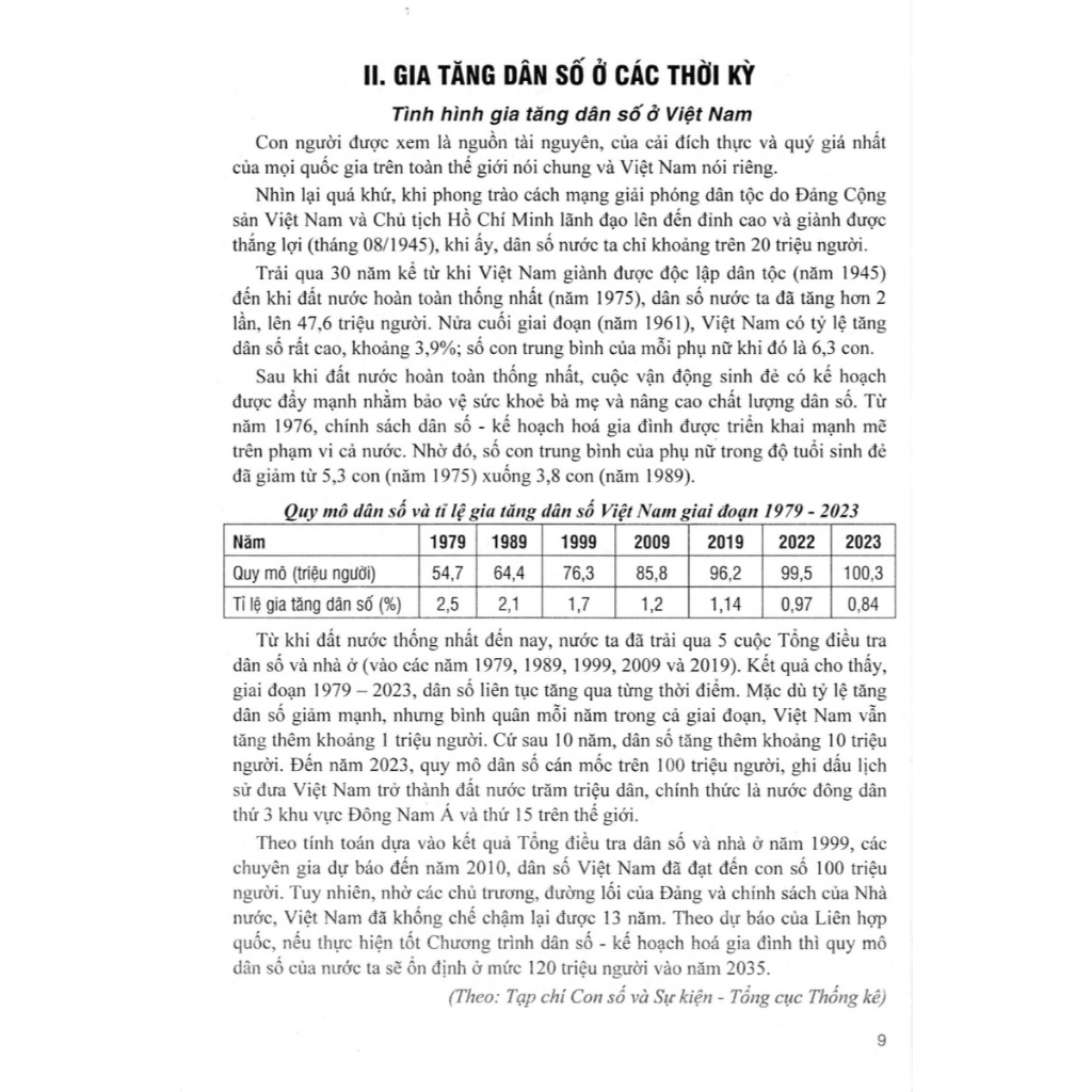 SÁCH - Tư liệu dạy - học địa lí 9 (dùng chung cho các bộ sgk hiện hành) Tư Liệu Dạy - Học Địa Lí 9 (Dùng Chung Cho Các Bộ SGK Hiện Hành) Sách TƯ LIỆU DẠY - HỌC ĐỊA LÍ 9 được biên soạn nhằm cung cấp cho giáo viên và học sinh các tư liệu cần thiết làm cơ sở hiểu sâu hơn các nội dung và yêu cầu cần đạt trong Chương trình giáo dục phổ thông môn Lịch sử và Địa lí, phần Địa lí góp phần nâng cao hiệu quả dạy học Địa lí phát triển phẩm chất và năng lực học sinh. Sách được biên soạn theo Chương trình giáo dục phổ thông môn Lịch sử và Địa lí (cấp Trung học cơ sở) (Ban hành kèm theo Thông tư số 32/2018/TT-BGD ĐT ngày 26 tháng 12 năm 2018 của Bộ trưởng Bộ Giáo dục và Đào tạo). Sách được trình bày theo các chủ đề nội dung của Chương trình. Nội dung sách gồm một số tư liệu cần thiết giúp bổ sung, làm sáng rõ hoặc cụ thể hoá các nội dung dạy – học địa lí dân cư, địa lí ngành kinh tế và sự phân hoá lãnh thổ Việt Nam theo chương trình phân môn Địa lí lớp 9 THCS. Các tư liệu chủ yếu được lấy từ các sách, tạp chí, bài báo nghiên cứu khoa học, sách/ bài báo phổ biến kiến thức khoa học, của các nhà nghiên cứu, nhà giáo, nhà khoa học, nhà báo, Chúng tôi rất mong được các tác giả cho phép và trân trọng bày tỏ lòng cảm ơn. Việc chọn lọc, tổng hợp và trình bày nội dung sách tham khảo địa lí theo chương trình mới, mặc dù các tác giả có nhiều nỗ lực nhưng chắc chắn không tránh khỏi những hạn chế, thiếu sót. Các tác giả rất mong nhận được những ý kiến đóng góp để cuốn sách được hoàn thiện, phục vụ thiết thực hơn hoạt động dạy và học ở nhà trường.