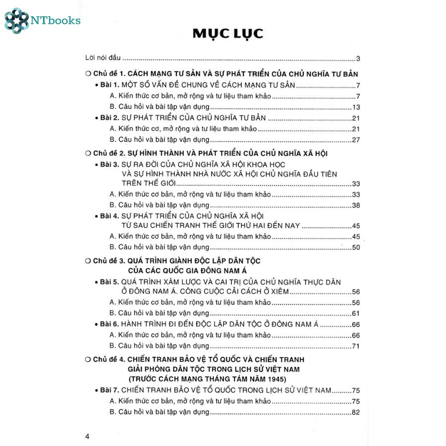 - Kiến thức cơ bản: Được tác giả biên soạn theo sách giáo khoa với từng ý chính, có tính logic, vừa giúp giáo viên soạn giảng cô đọng, ngắn gọn và dễ hiểu, vừa giúp học sinh dễ nắm vững kiến thức từng bài làm cơ sở vận dụng giải quyết những vấn đề lịch sử theo hướng mở rộng, nâng cao.