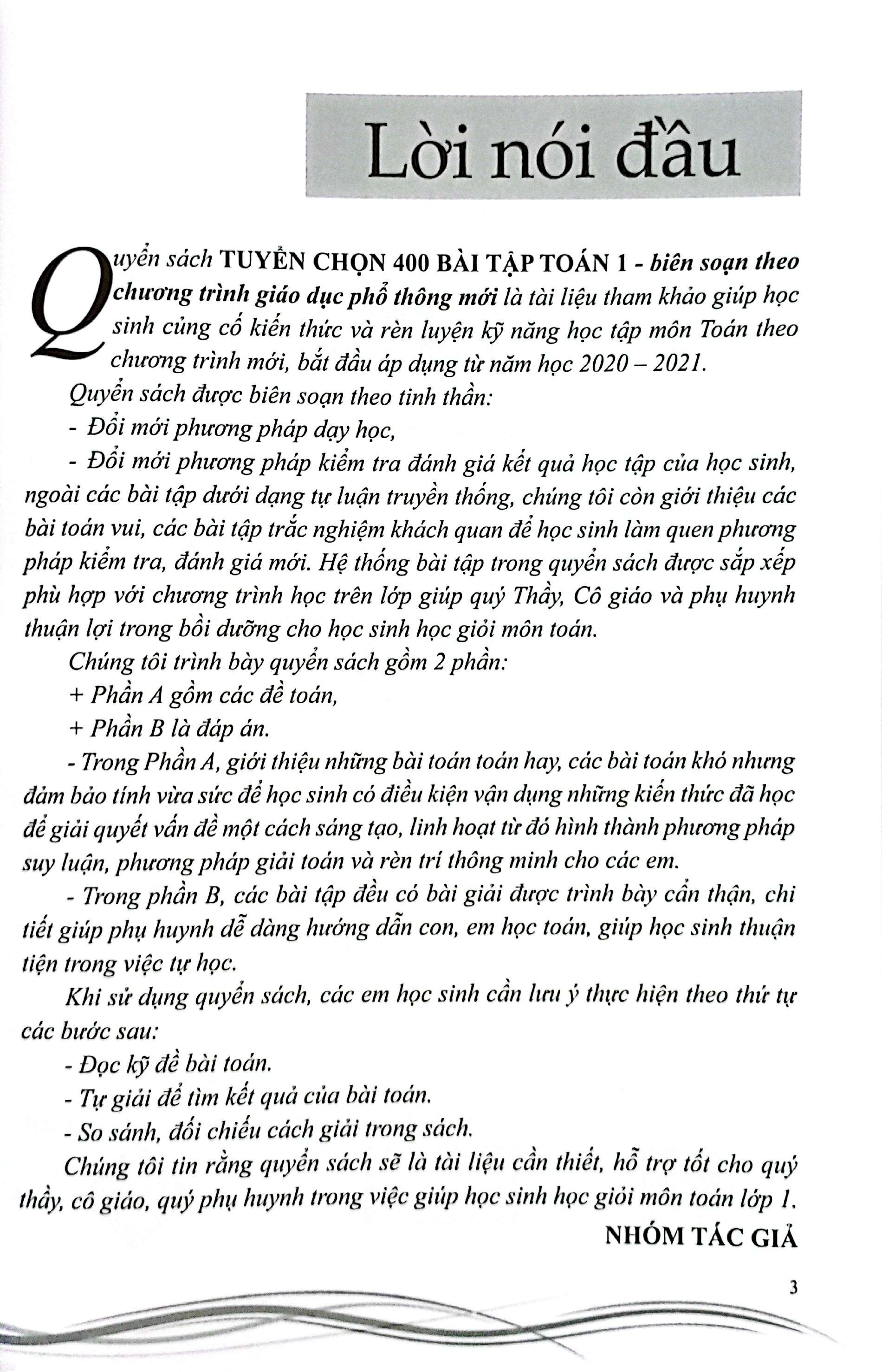 Quyển sách TUYỂN CHỌN 400 BÀI TẬP TOÁN 1 - biên soạn theo chương trình giáo dục phổ thông mới là tài liệu tham khảo giúp học sinh củng cố kiến thức và rèn luyện kỹ năng học tập môn Toán theo chương trình mới, bắt đầu áp dụng từ năm học 2020 – 2021.