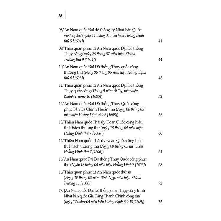 Mua tại TiktokSách - Việt Nhật Thông Thư - Các Bức Quốc Thư Bang Giao Giữa Chính Quyền Đàng Trong Với Nhật Bản Thế Kỷ XVI - XVII "Việt-Nhật thông thư" là một phần của Ngoại phiên thông thư được lưu trữ tại Nhật Bản. Đó là các quốc thư bang giao giữa Chúa Nguyễn ở Đàng Trong và Mạc phủ Nhật Bản trong thế kỷ XVI - XVII được TS. Võ Vinh Quang sưu tầm, giám định làm tư liệu để phục vụ cho đề tài Lịch sử Việt Nam, tập 11 (Đàng Trong 1558-1771), mã số KHXH-LSVN.11/14-18 của bộ Lịch sử Việt Nam do . Đỗ Bang làm chủ nhiệm và Hội Khoa học Lịch sử tỉnh Thừa Thiên Huế làm cơ quan chủ trì đề tài. Trong 79 quốc thư giao dịch giữa Chính quyền Đại Việt với Mạc phủ Nhật Bản, có đến 48 bức quốc thư của chính quyền Chúa Nguyễn ở Đàng Trong.