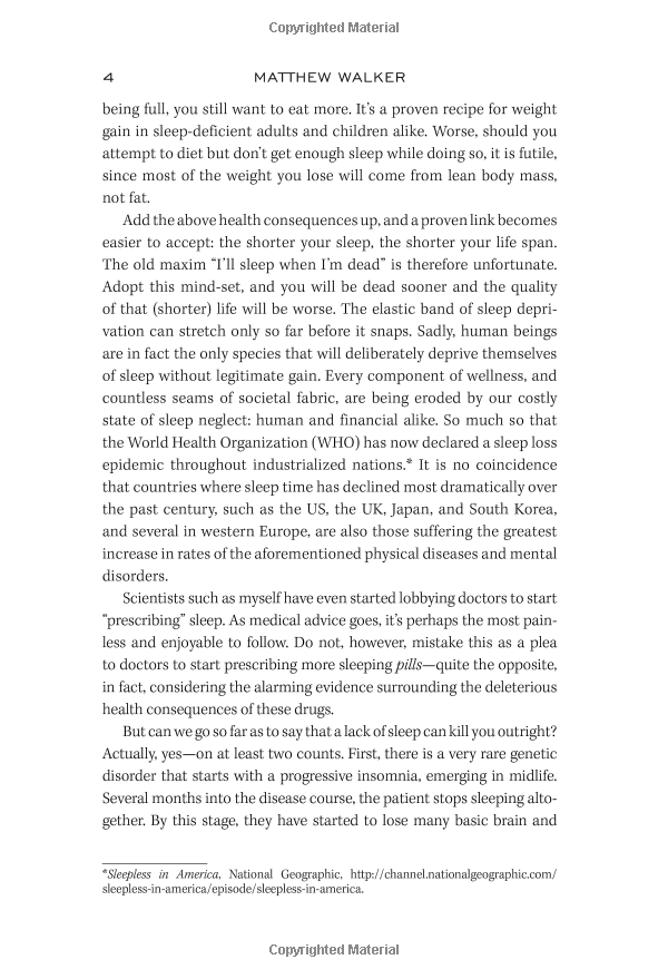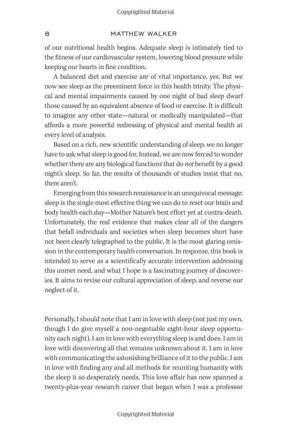 The first sleep book by a leading scientific expert--Professor Matthew Walker, Director of UC Berkeley's Sleep and Neuroimaging Lab--reveals his groundbreaking exploration of sleep, explaining how we can harness its transformative power to change our lives for the better. Sleep is one of the most important but least understood aspects of our life, wellness, and longevity. Until very recently, science had no answer to the question of why we sleep, or what good it served, or why we suffer such devastating health consequences when we don't sleep. Compared to the other basic drives in life--eating, drinking, and reproducing--the purpose of sleep remained elusive. An explosion of scientific discoveries in the last twenty years has shed new light on this fundamental aspect of our lives. Now, preeminent neuroscientist and sleep expert Matthew Walker gives us a new understanding of the vital importance of sleep and dreaming. Within the brain, sleep enriches our ability to learn, memorize, and make logical decisions. It recalibrates our emotions, restocks our immune system, fine-tunes our metabolism, and regulates our appetite. Dreaming mollifies painful memories and creates a virtual reality space in which the brain melds past and present knowledge to inspire creativity.