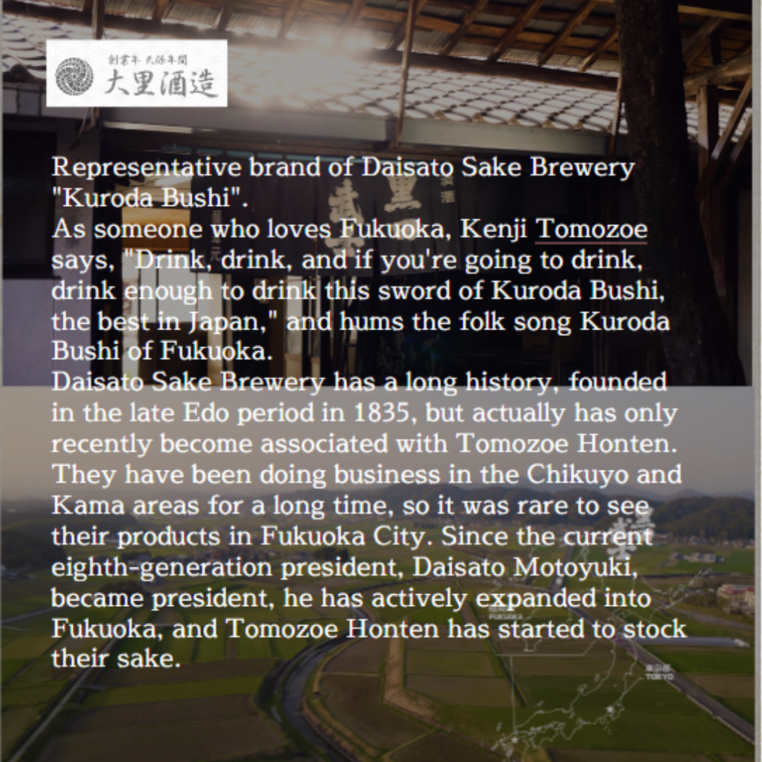 Rượu sake không lọc, "Kuroda Bushi Nigorizake", được làm từ gạo thu hoạch vào đầu mùa thu đã hấp thụ