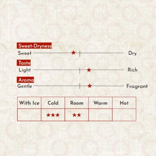 Được ủ trong thùng gỗ tuyết tùng ngay trước khi đóng chai, loại rượu Sake Taru ("thùng") này bùng nổ với hương vị nồng nàn và đặc sắc. Có vị cay và hương thơm thảo